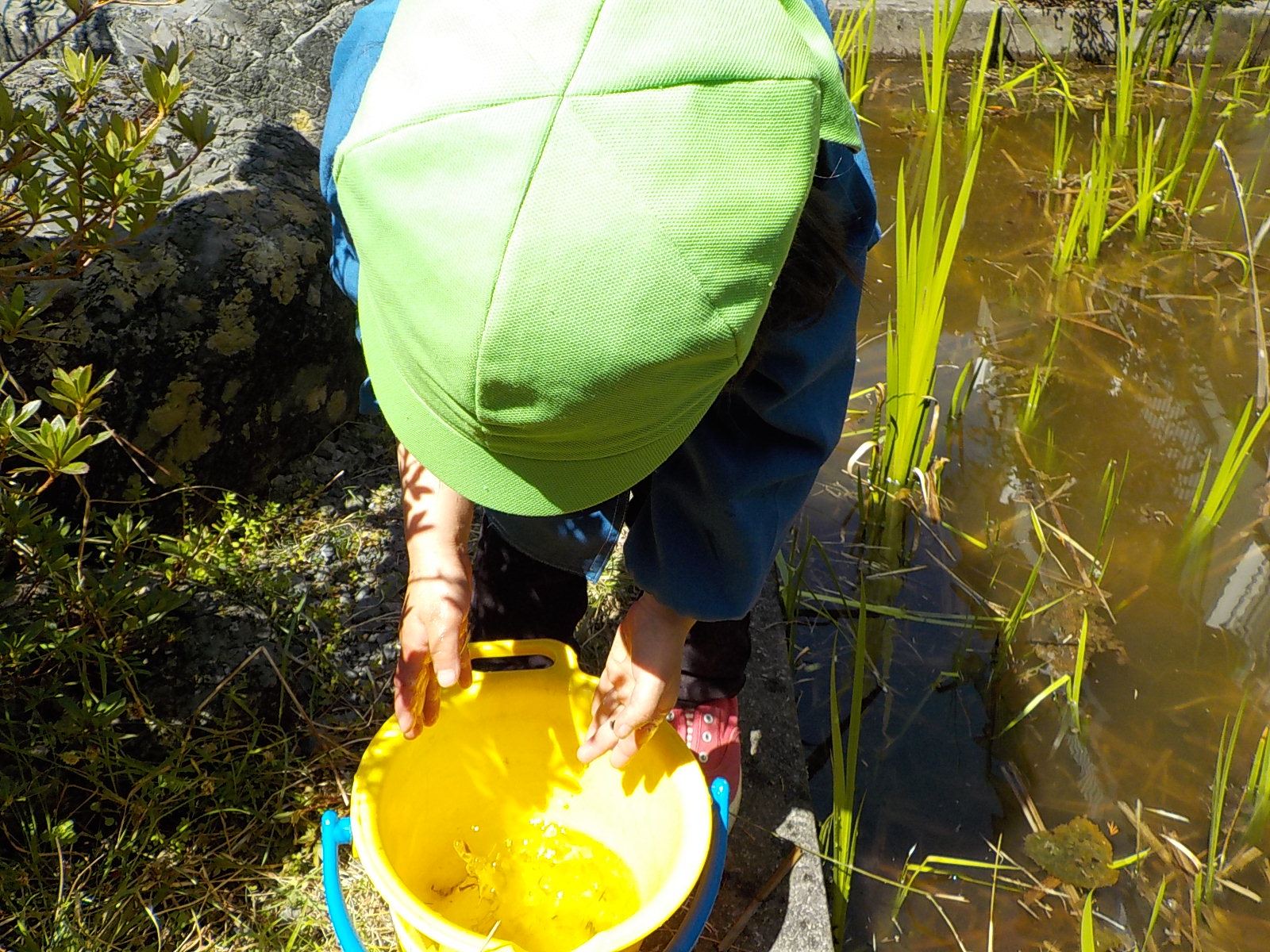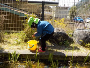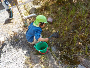 4月、上村小学校の1年生と先生から「アズマヒキガエルが卵を産んだのでみにきてください」とお誘いがありさっそくバケツを持ってでかけました。