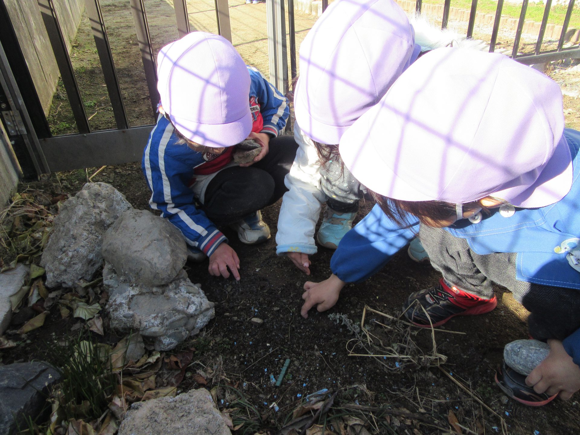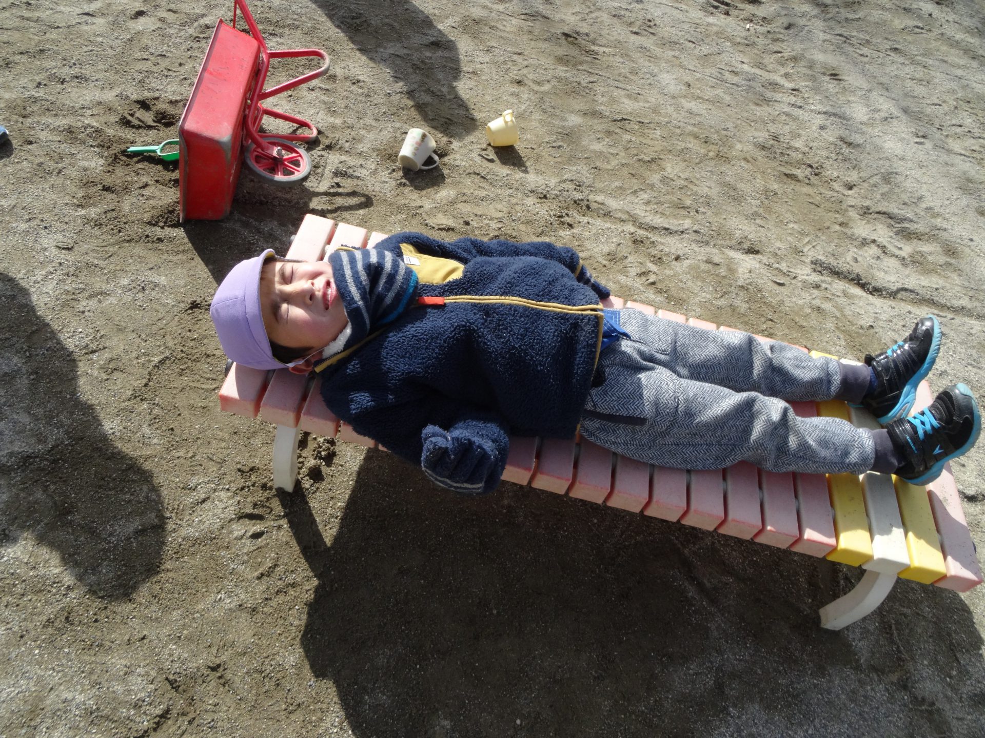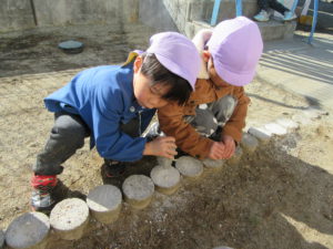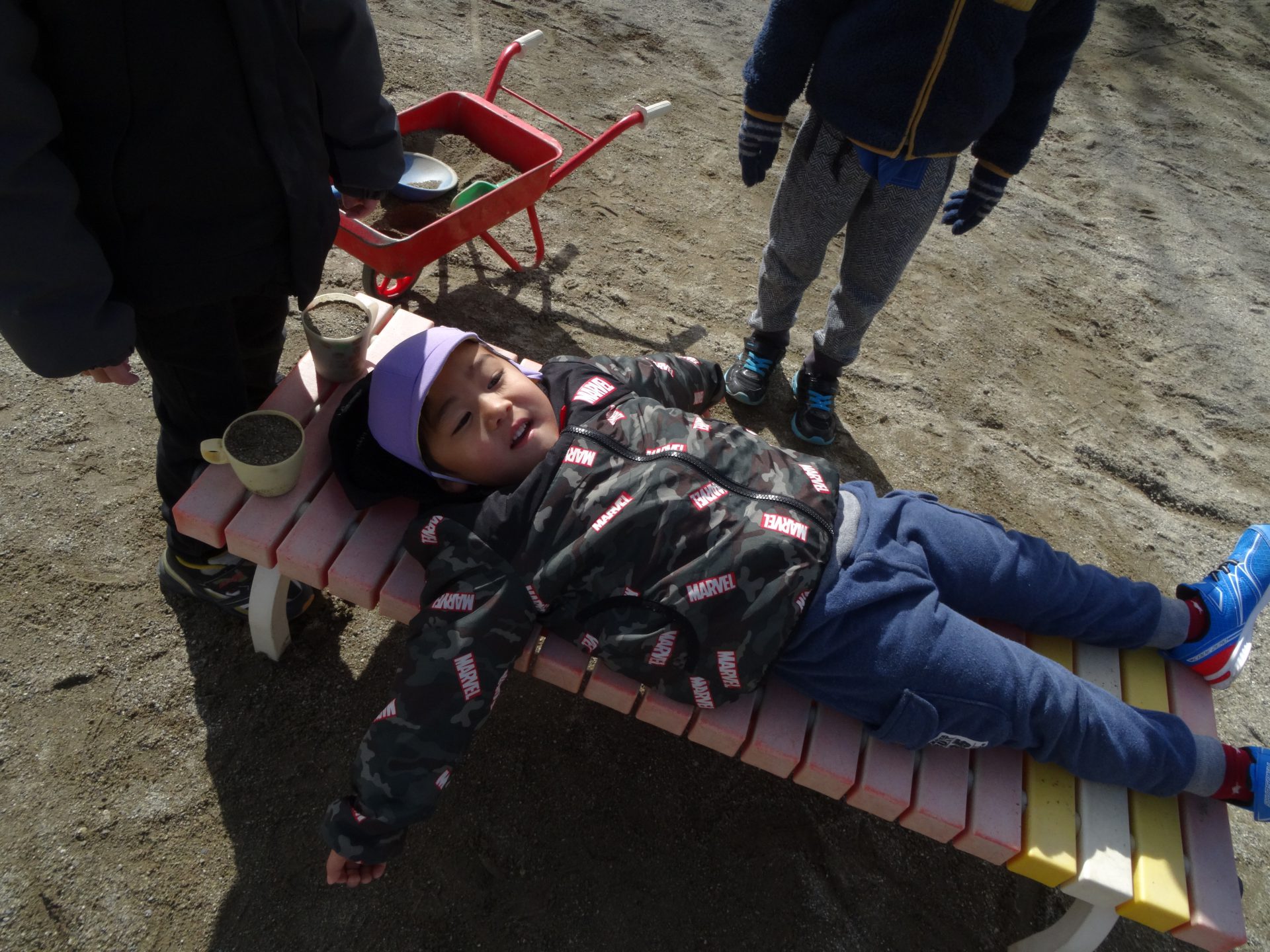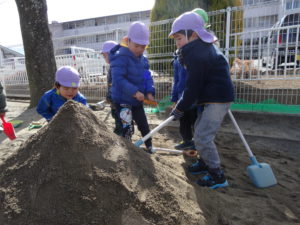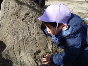 ・砂が硬くなっていることや日向ぼっこをすると暖かいことを子どもが自分で気づくことができよかった。保育士が少し手を貸したり、声かけをしたりすると自分たちで遊びを展開したり遊びこんだりする姿が見られた。