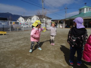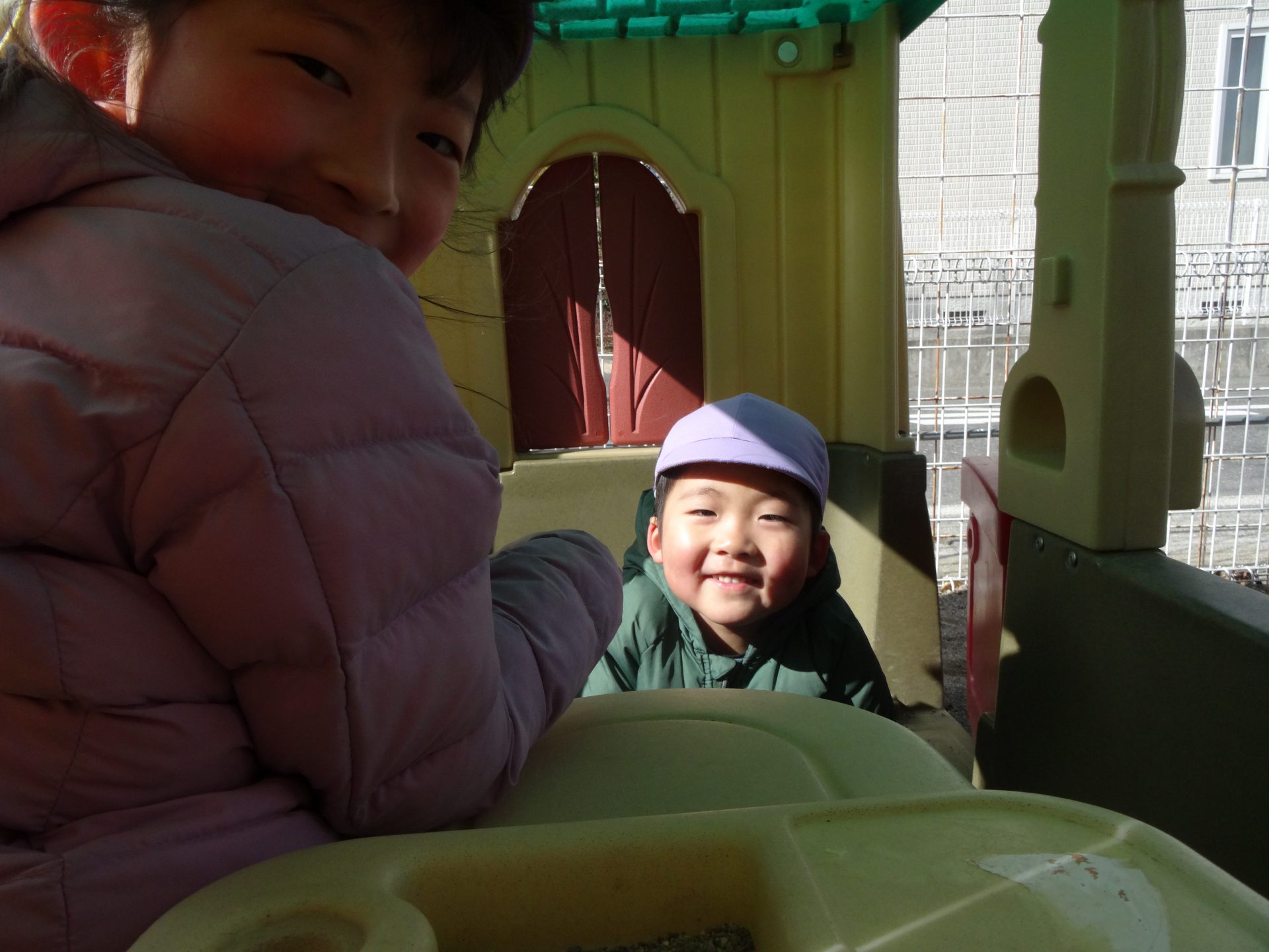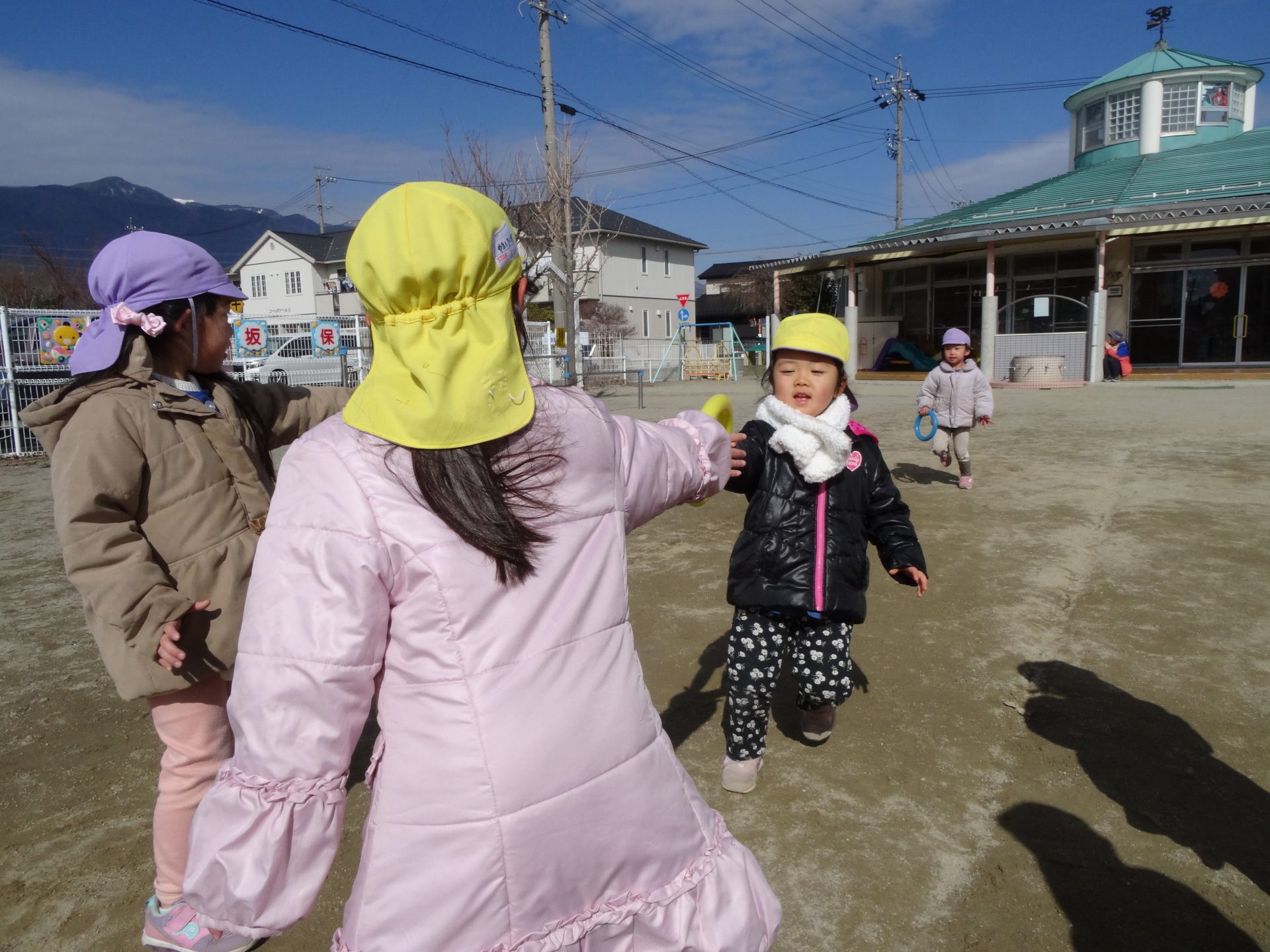 している。この日も製作をする予定であったが外が暖かく子どもたちも外で遊びたい様子であったため戸外で遊ぶ。