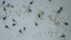まだこんなに小さいおたまじゃくし。子ども達広いプールの中からよく捕まえることができました。