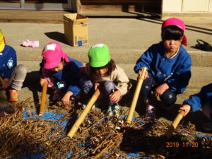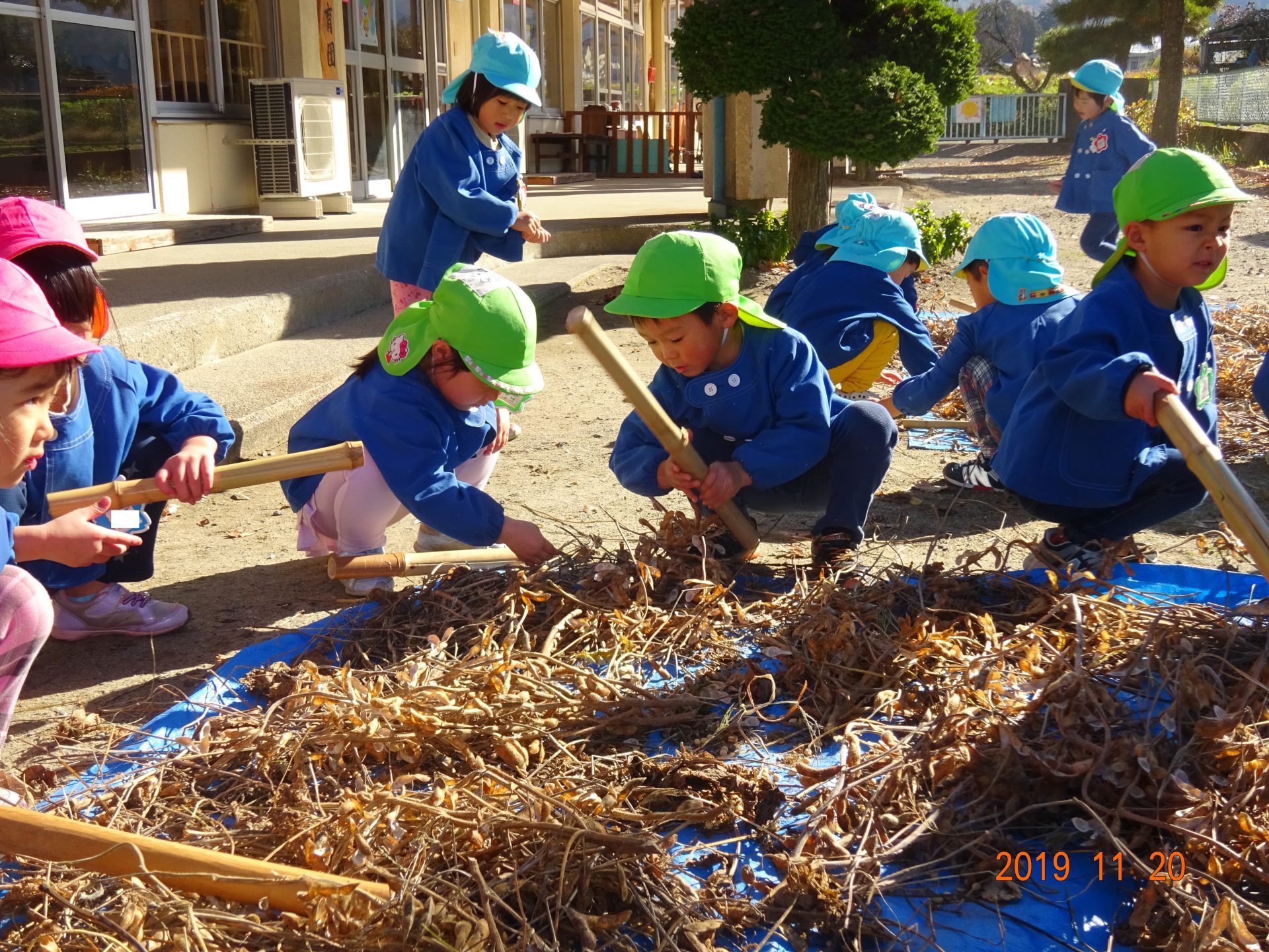 ・棒で叩くとさやから豆が出てくることや、昔の農具を使って