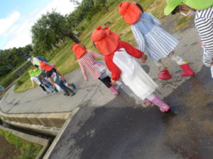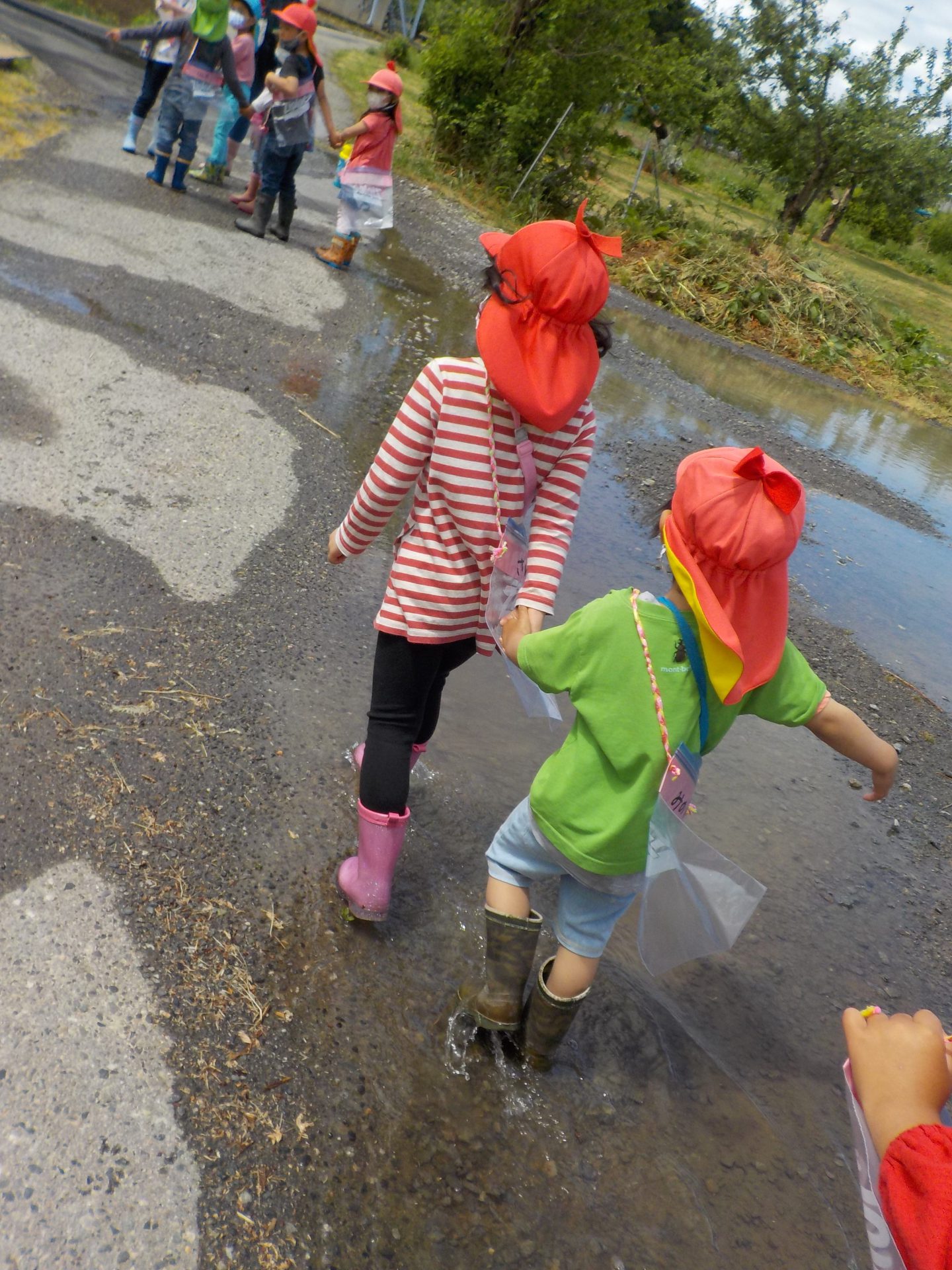 年中児は、それを見つけると、「おふろあった!」と喜び、水たまりの中へジャブジャブと入って行きます。
