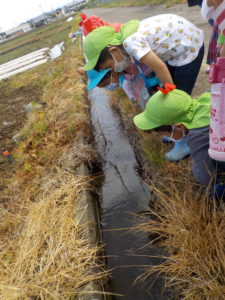 堰の中に生えている藻も気になり、「わかめってこういうところにあるかな?」年中児が発見すると、年長児が「図鑑で調べてみようか」