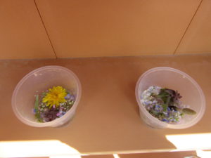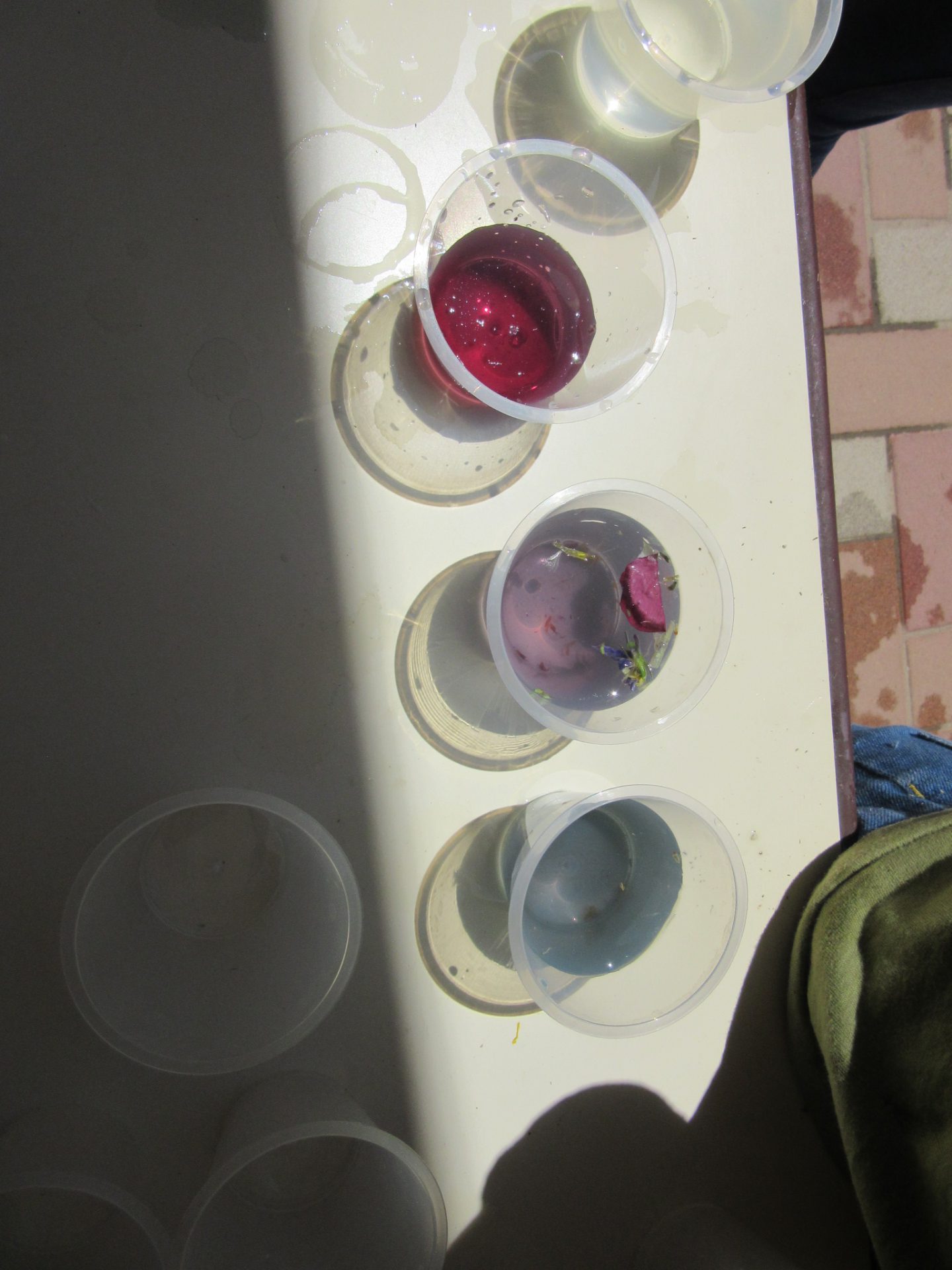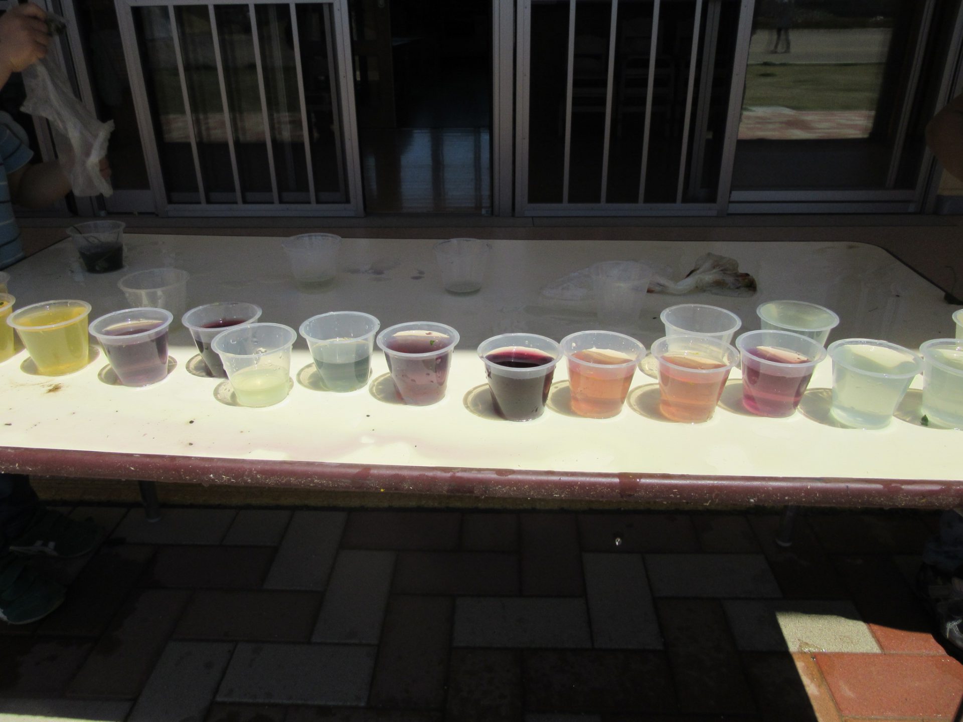 ☆身近な自然物を使って遊ぶおもしろさや、その自然物から作りだされた色水の美しさ、水が染まっていく様子などを知ってほしいと願いました。