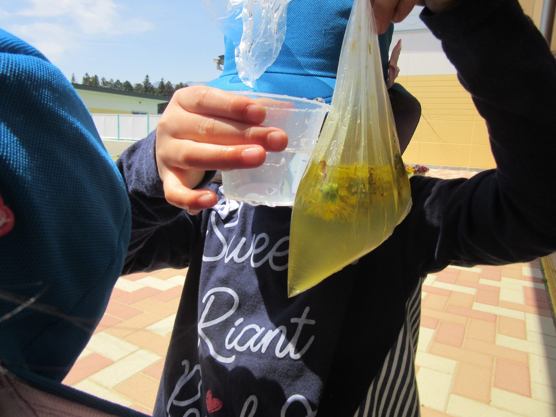 「みてみて!!黄色になってきたよー!!」「タンポポジュースができたぁ」