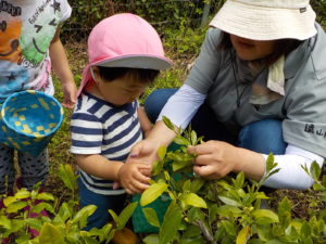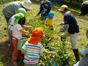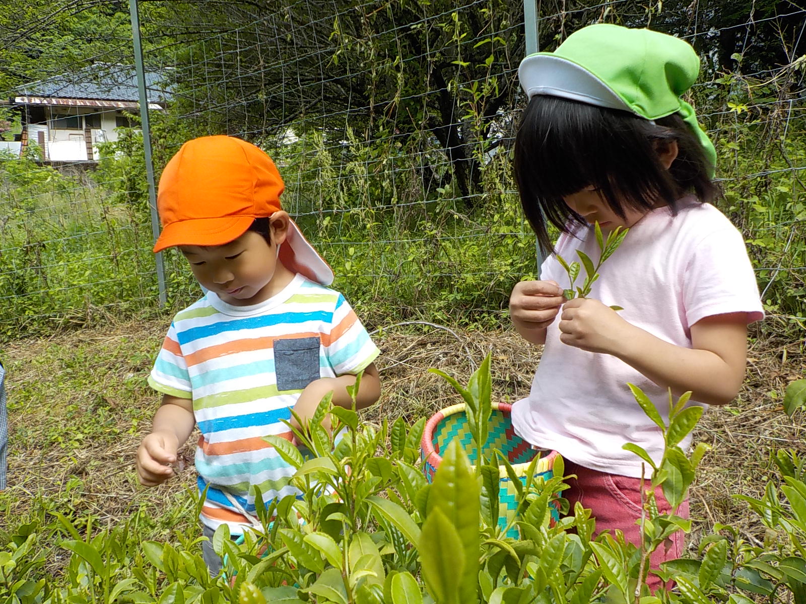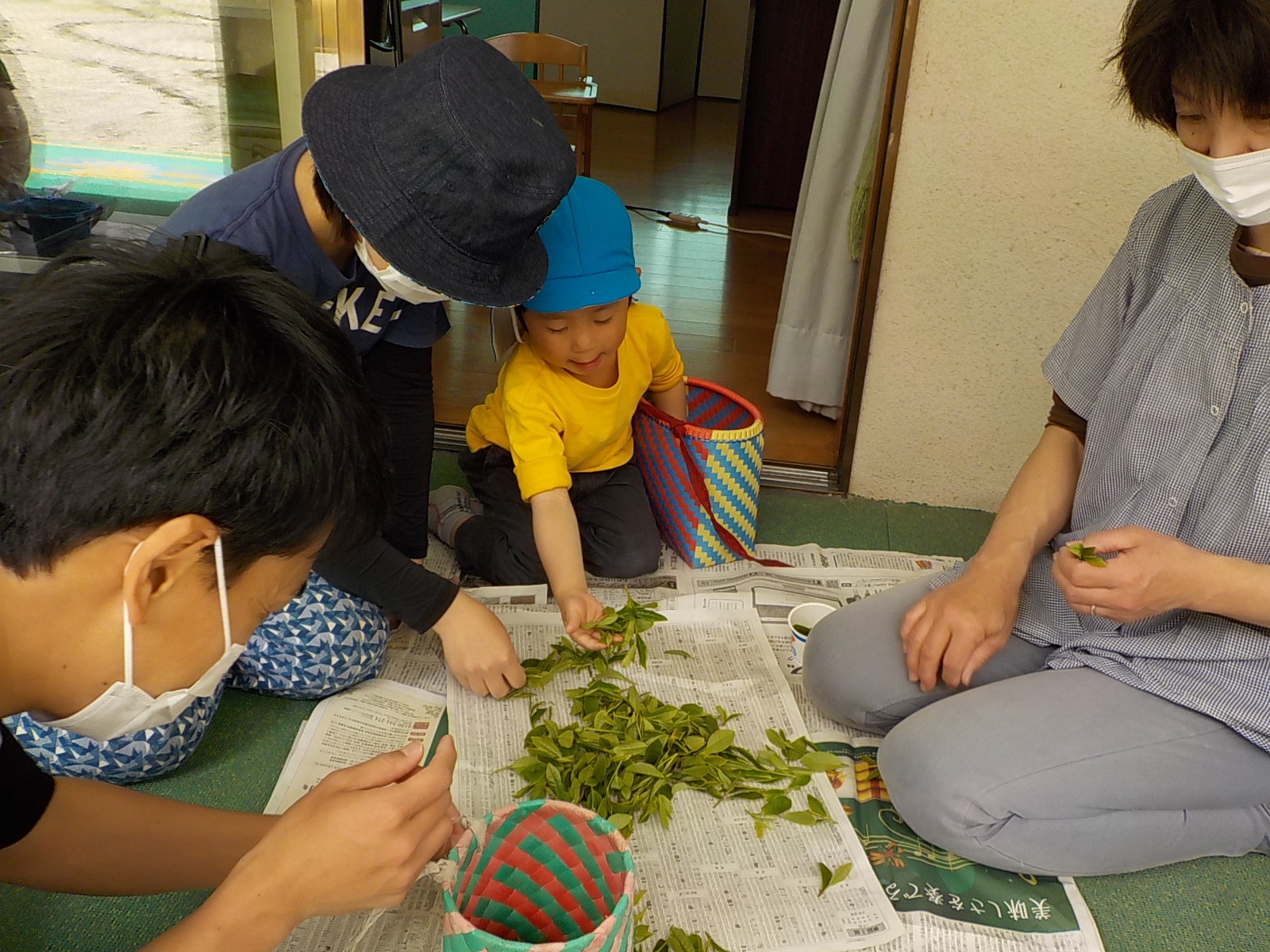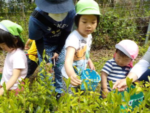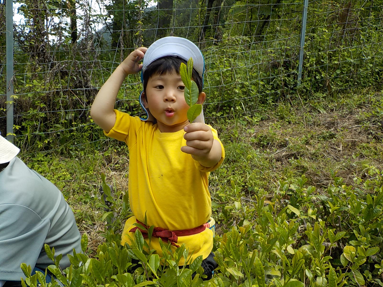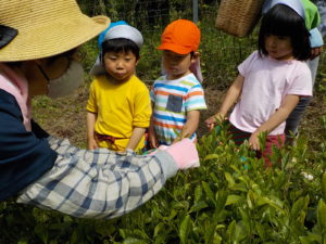 保育園の裏山に少しですがお茶の木があることを昨年発見し、今年はここでお茶を摘もうと決めていました。そして嬉しいことに、昨年初めてお茶摘みをした年長さん、年中さんは「一芯三葉」を覚えていたのです。