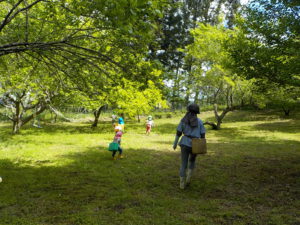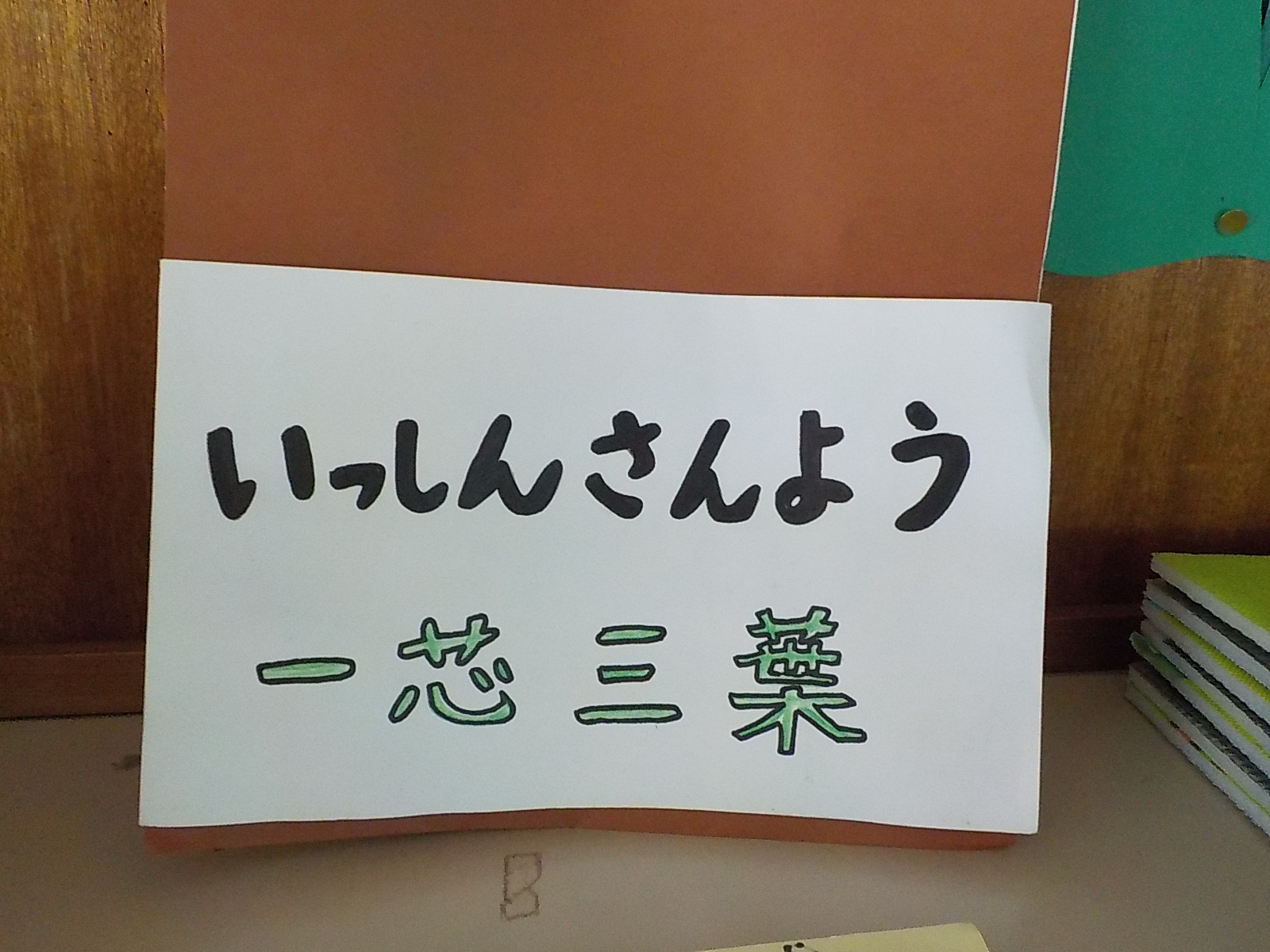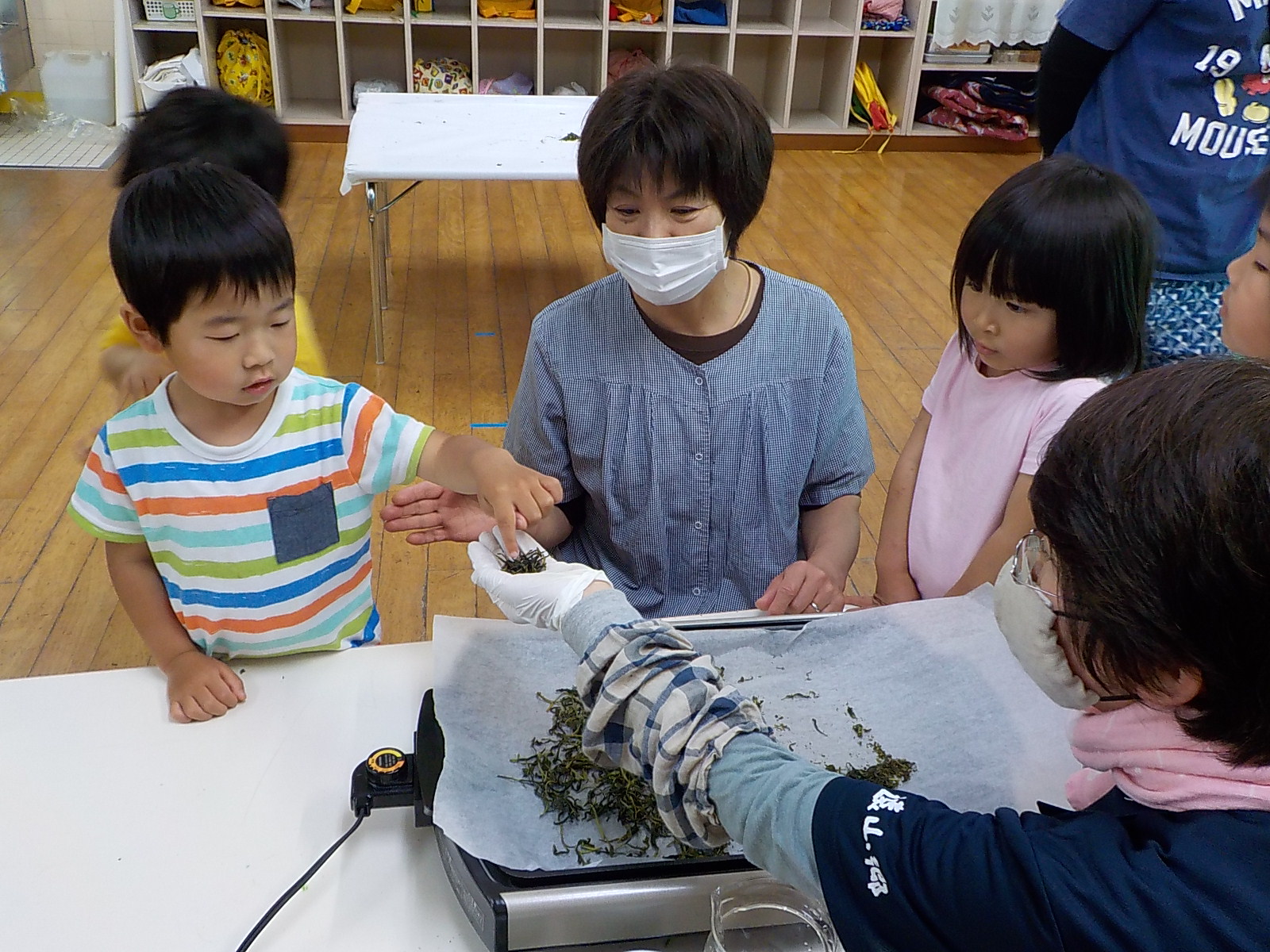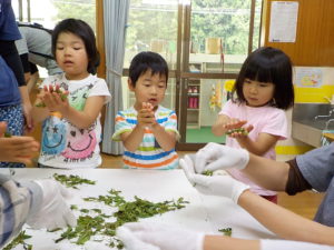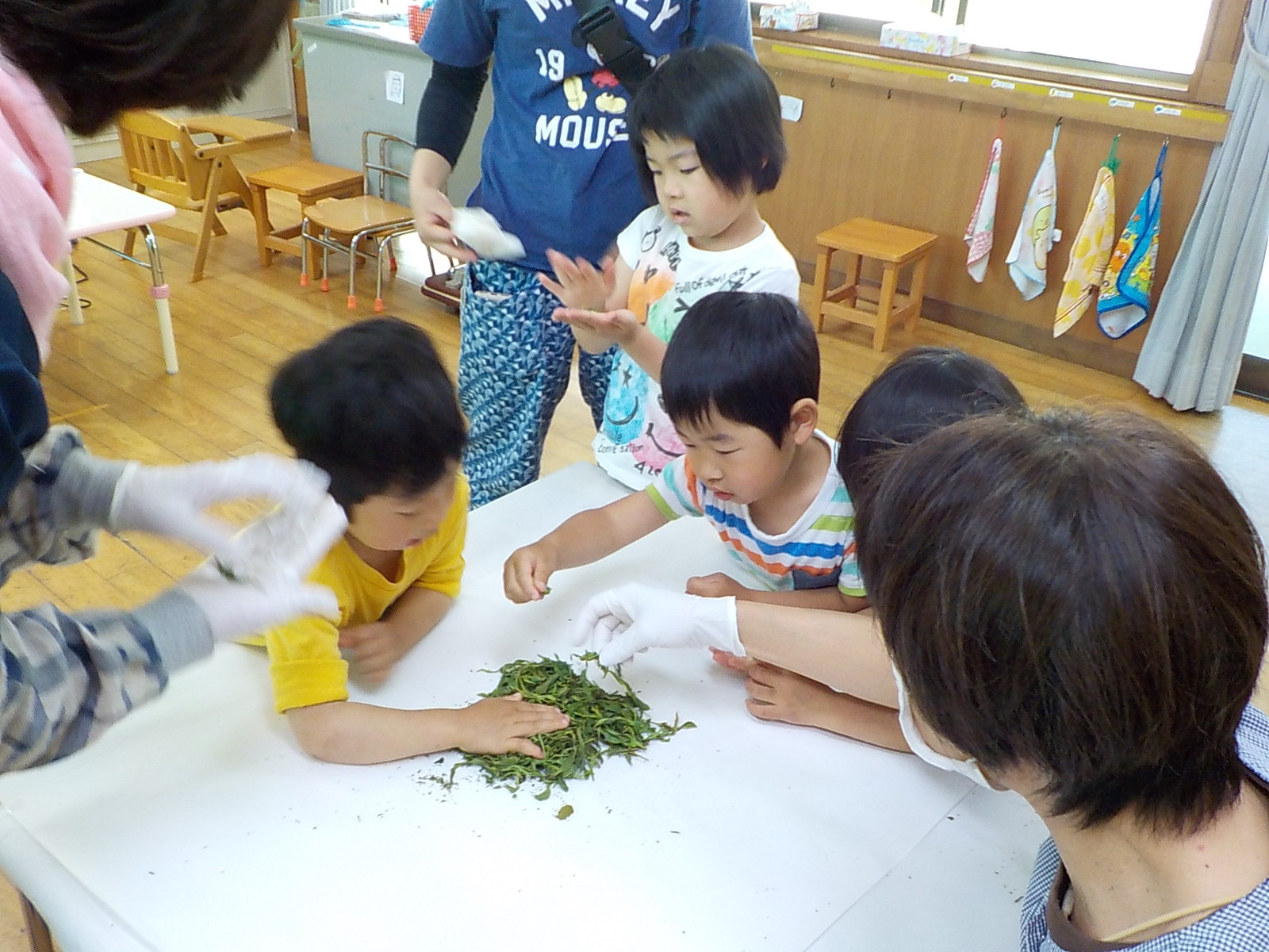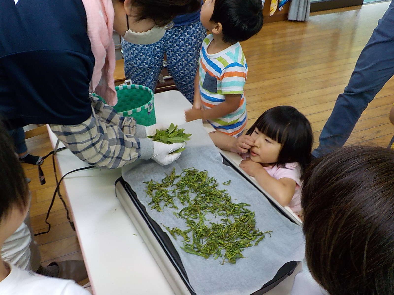 保育園の裏山に少しですがお茶の木があることを昨年発見し、今年はここでお茶を摘もうと決めていました。そして嬉しいことに、昨年初めてお茶摘みをした年長さん、年中さんは「一芯三葉」を覚えていたのです。