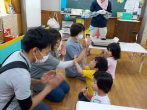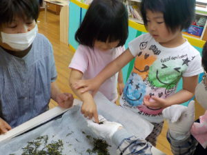 広げて両手で揉みます。コマを回すように一方向へくるっと揉みます。難しいね。頑張って!