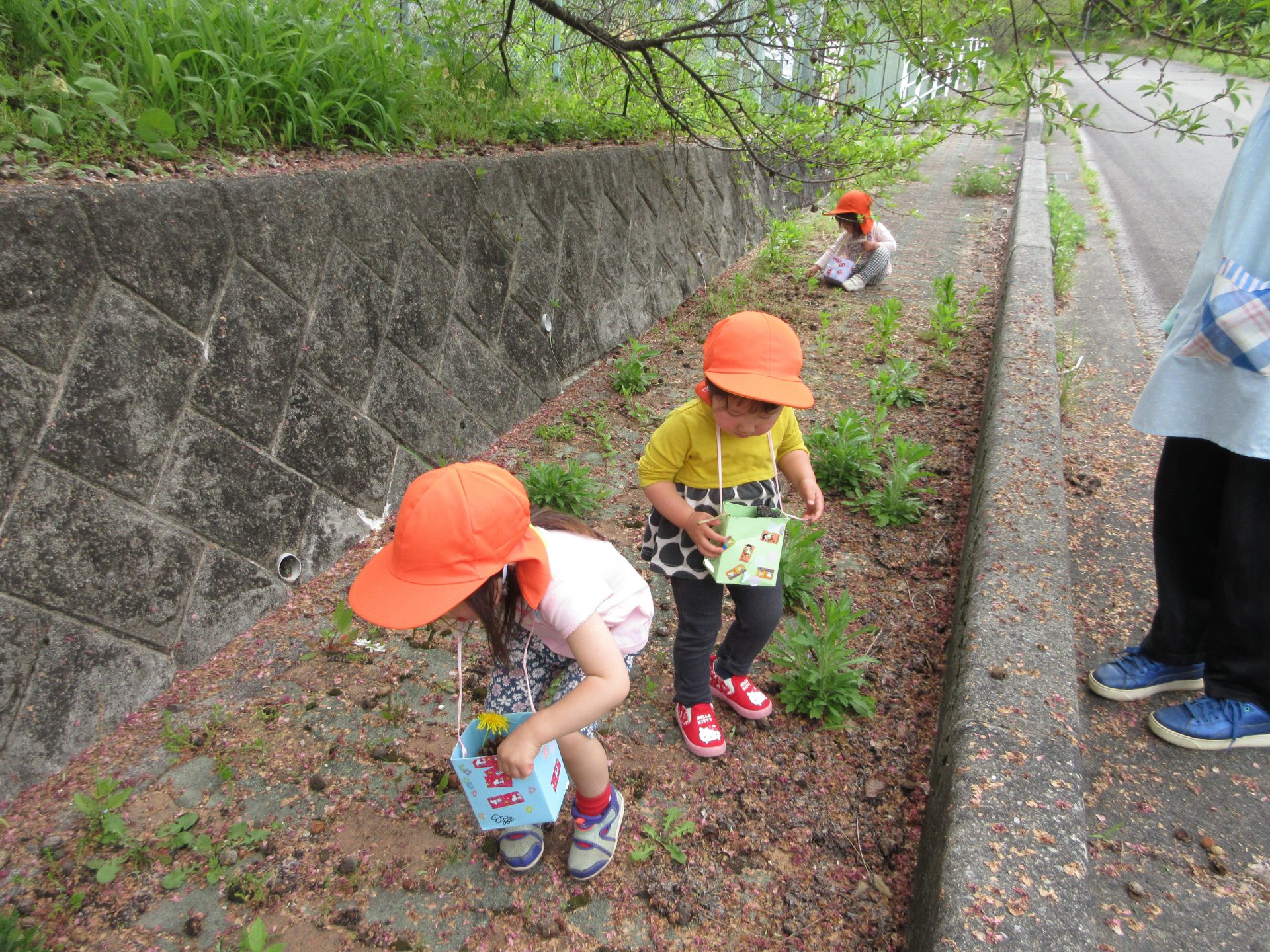 いつもは手を繋いで歩く道も、自由に歩くことで、花を摘んだり、探したりしながら歩く未満児さん。