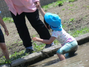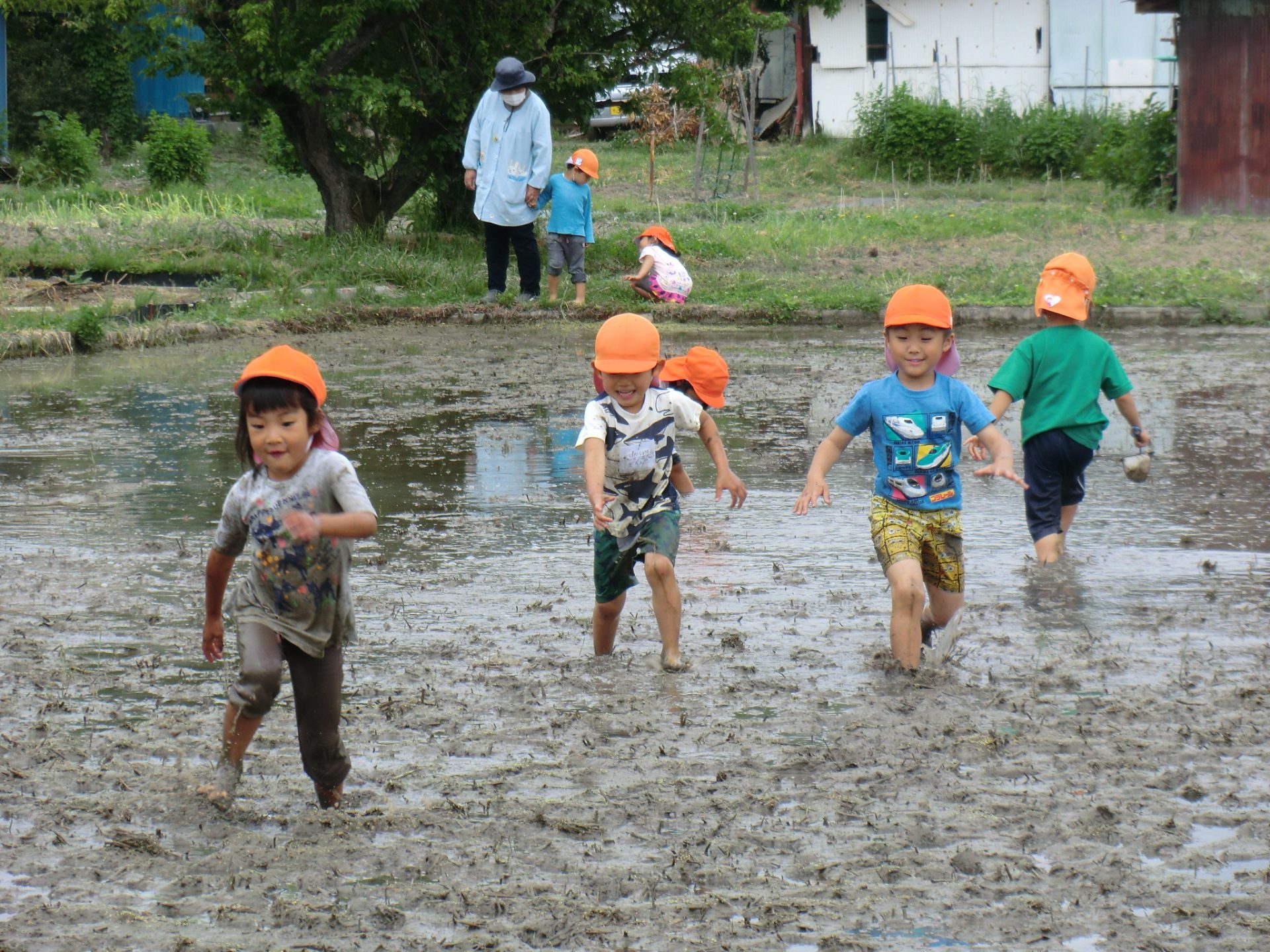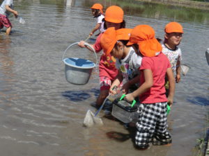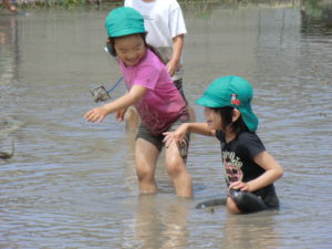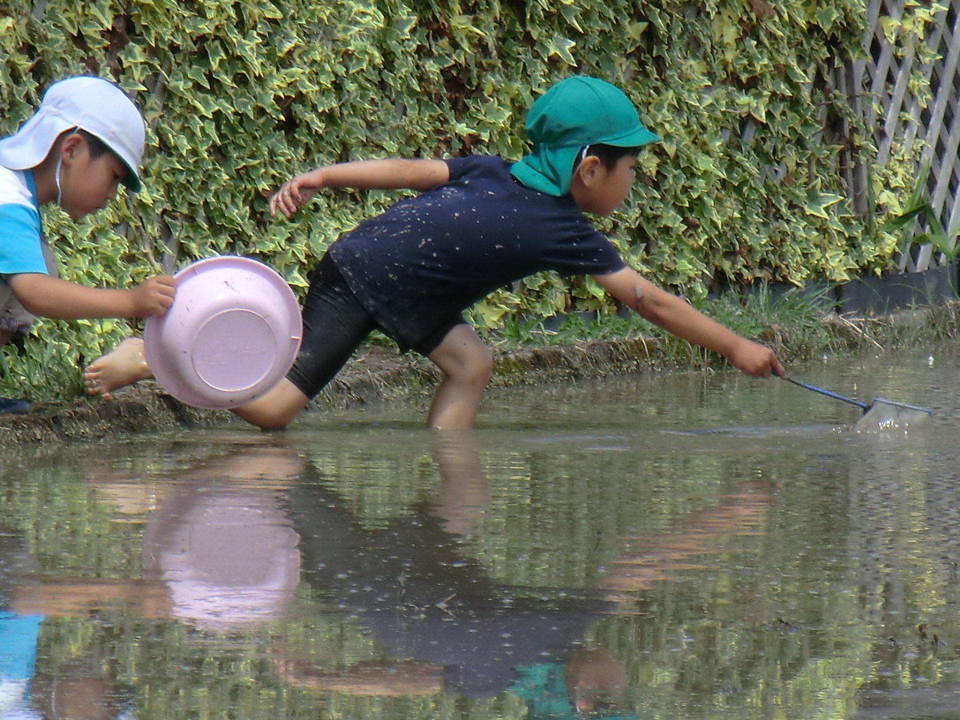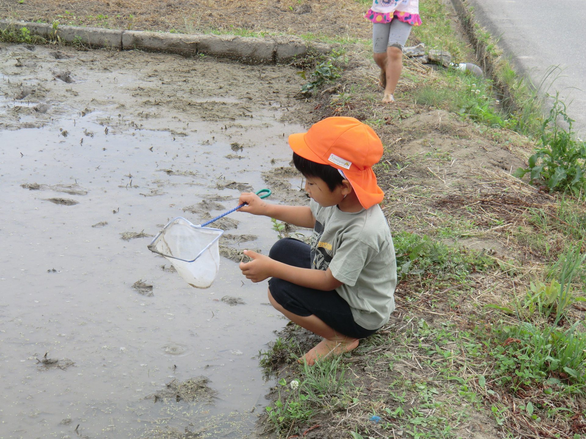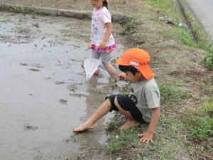 翌週になり、泥んこの服を着て年長児、年少児が田んぼへ遊びに行く。先週にはいなかったオタマジャクシがいて、おたまじゃくし取りを楽しむ子、アメンボを捕まえようとする子、タガメ、などの虫を見つけ飼育ケースに入れて保育園に持ってくる。