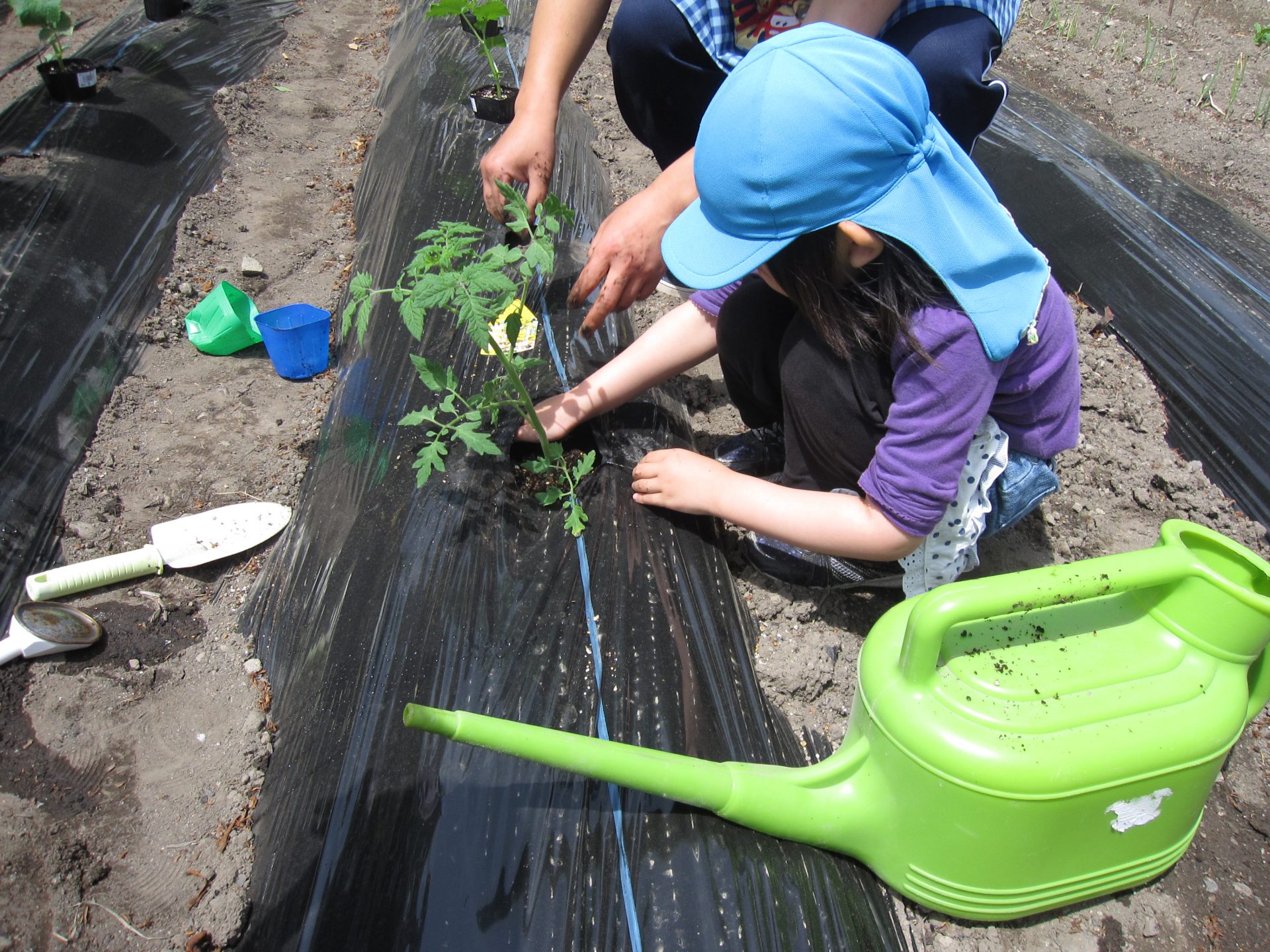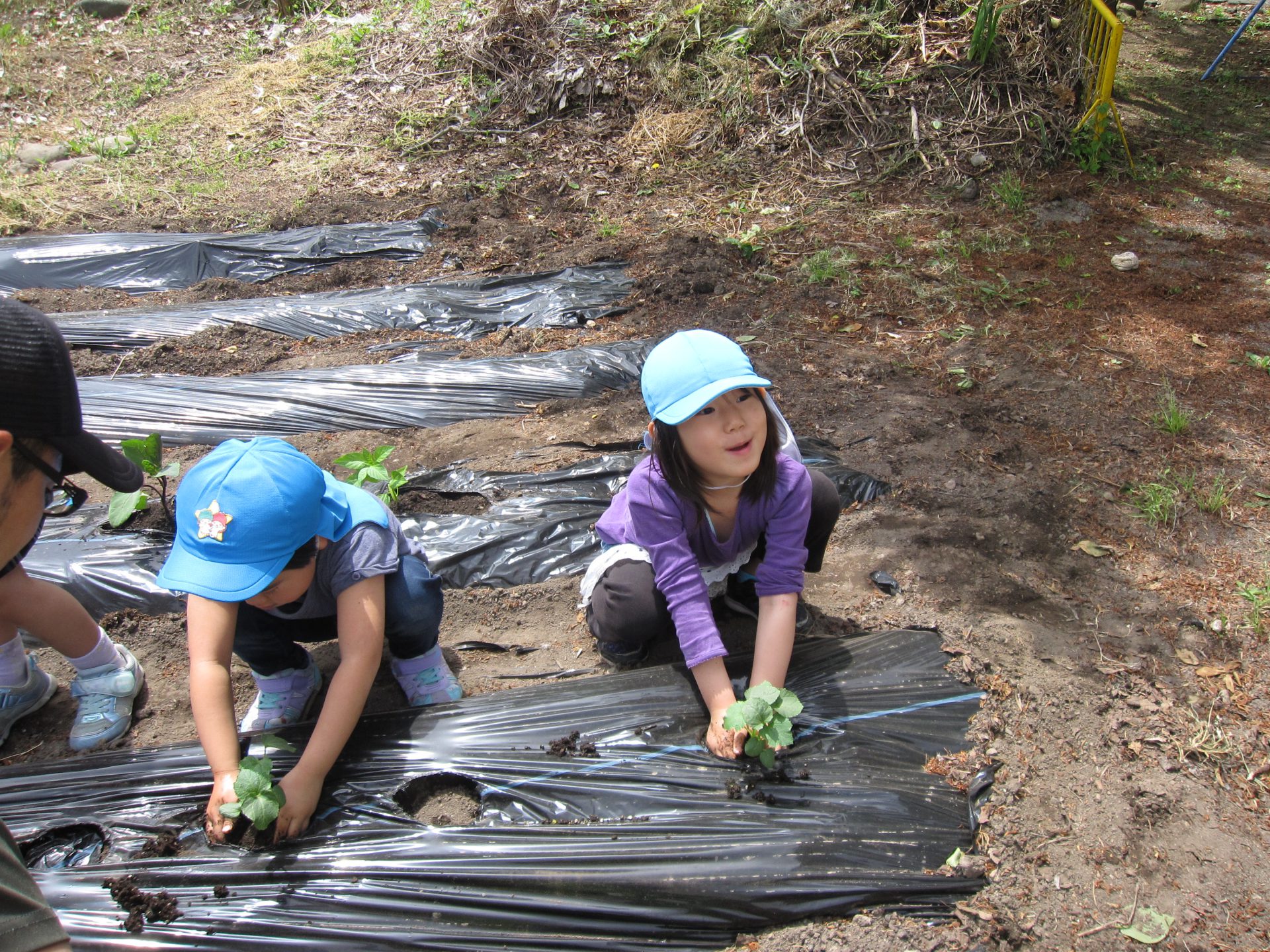 苗を植える数日前に保育士でマルチを準備。当日穴を開け、子どもたちが土を掘りました。穴を掘りながら「土の中、あったか~い♪」「なんかフカフカしてるね」なんて会話が聞こえてきました。普段触れる砂場の感触との違いに気付いた子どもたち。
