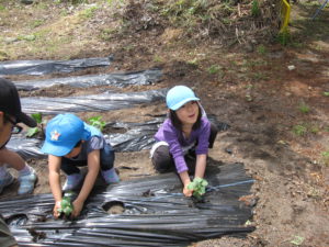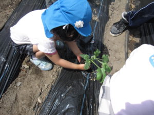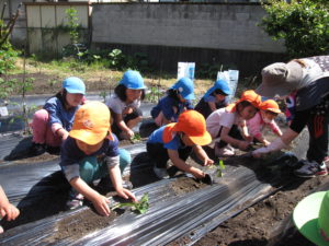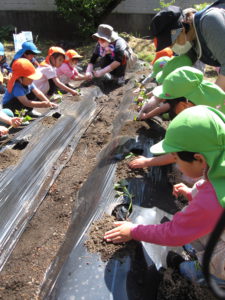 毎年、年長さんを中心に園庭横の畑で野菜作りをしています。今年も子どもたちの案から、キュウリ・ミニトマト・ナス・オクラ・ピーマン・スイカ・ポップコーン・ジャガイモ・サツマイモを育てることに決まりました。年長さんで植え付けにも挑戦!
