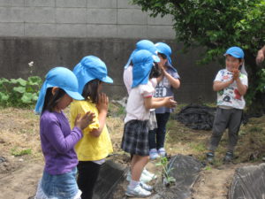 「早く大きくなりますように」みんなで手を合わせて、畑にパワーを送ります。