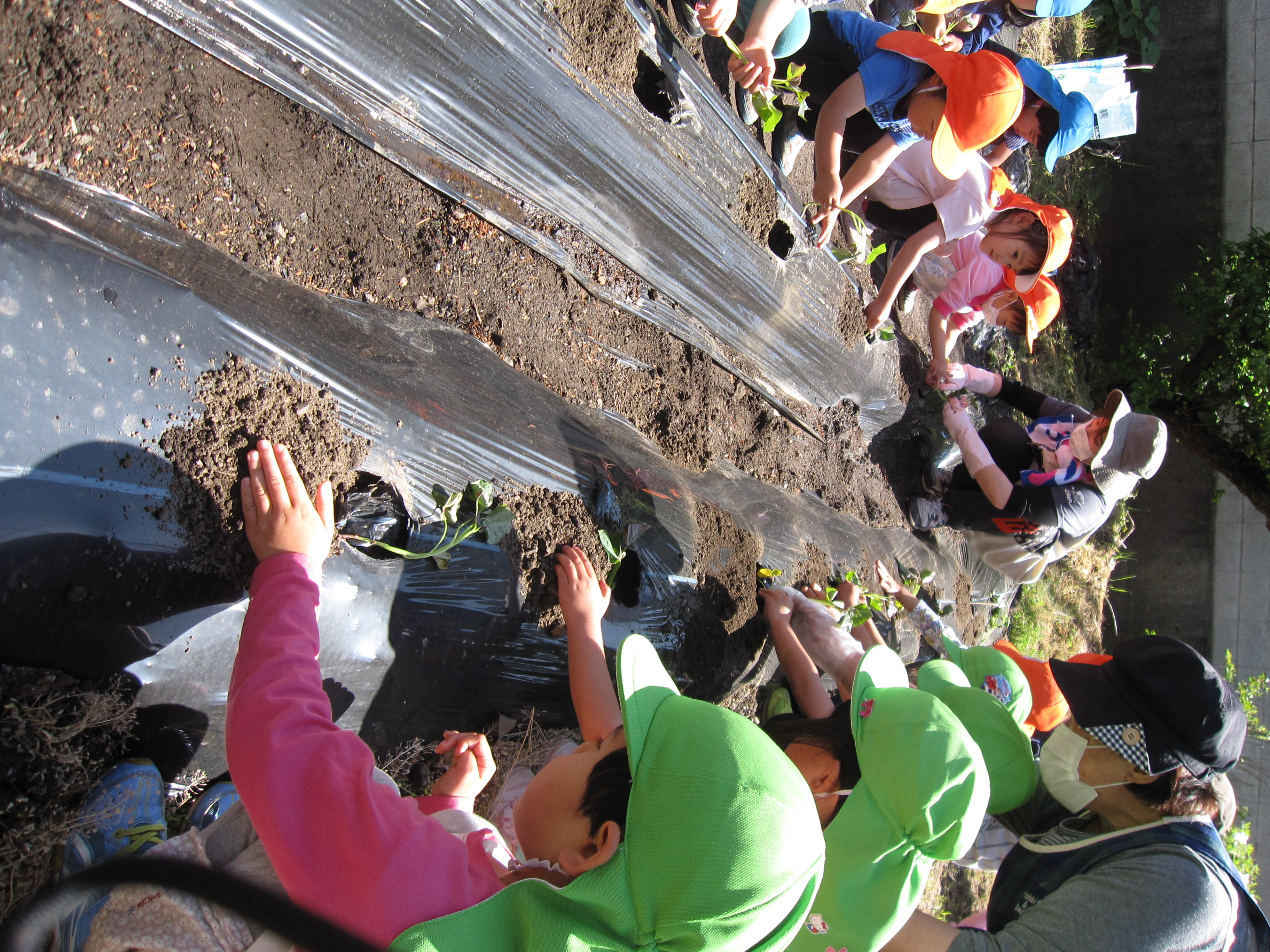 サツマイモは年少さん、年中さんも一緒に行いました。年少さんにとっては初めての苗植え。年長さんの姿を見ながら挑戦!