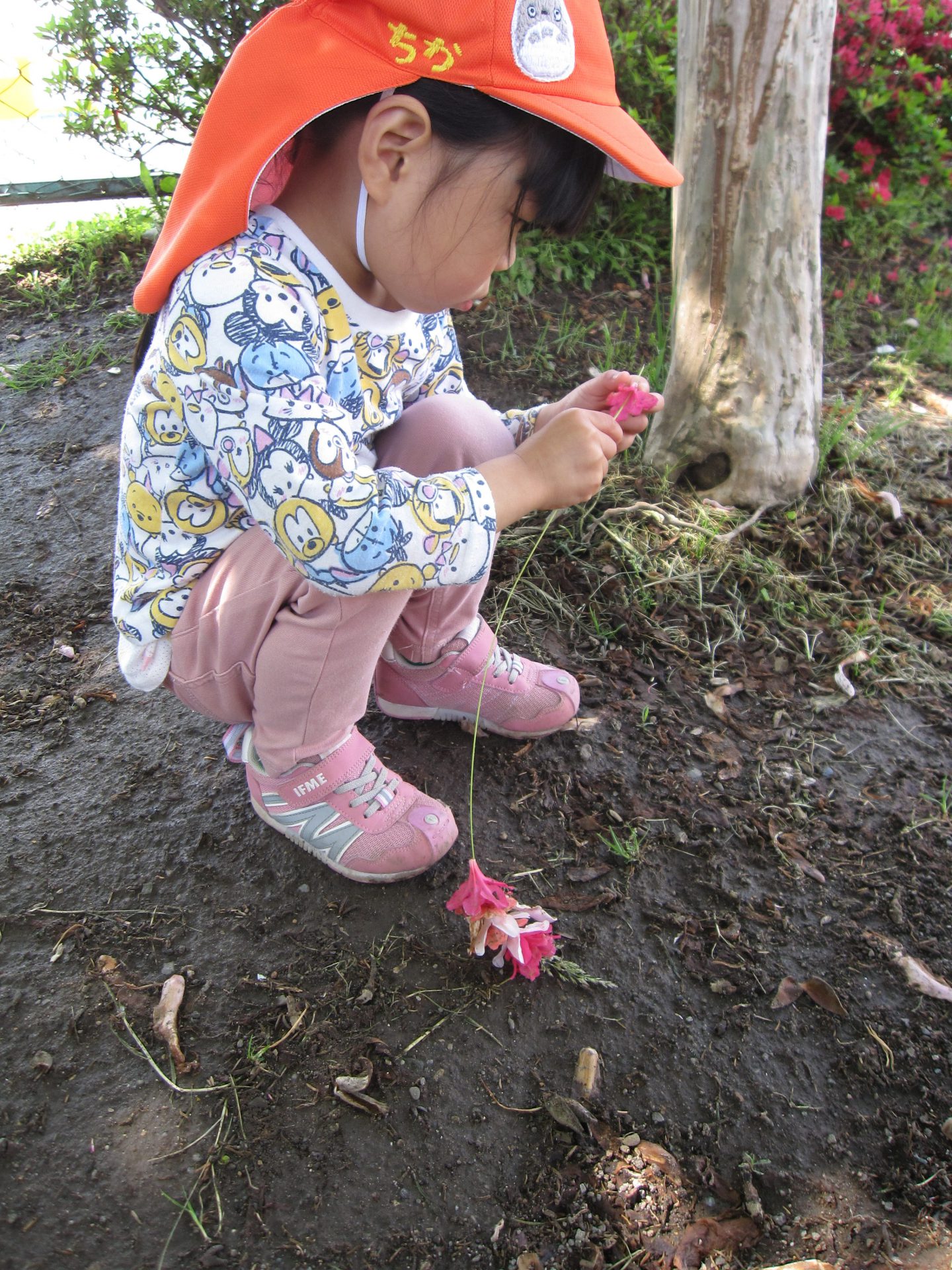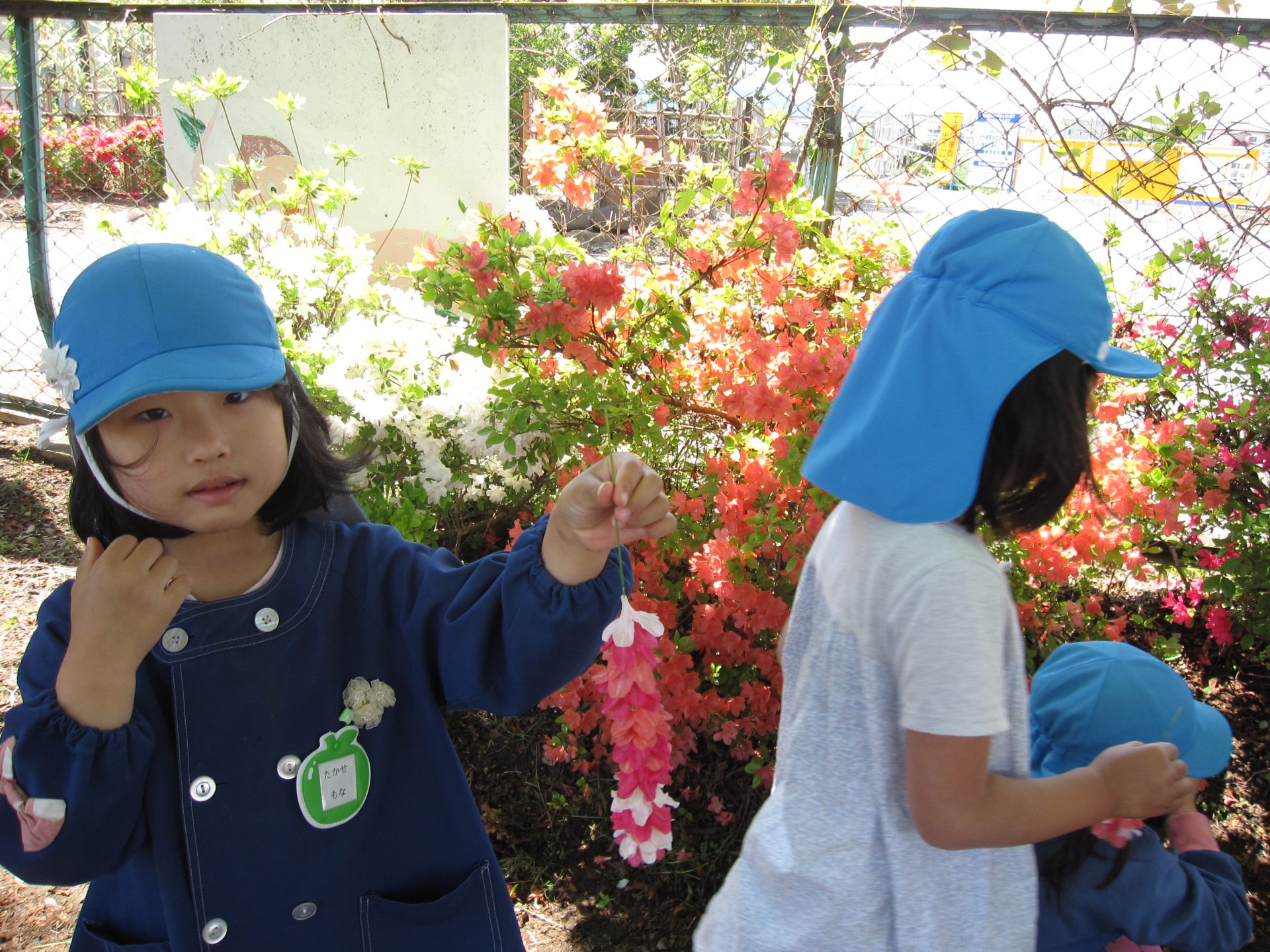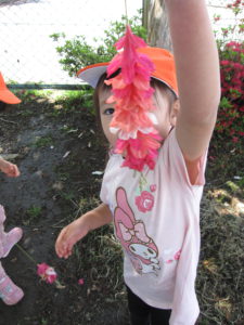 今年も園庭につつじの花が咲きました。落ちている花を見つけ、草に通してつなげていくと・・・
