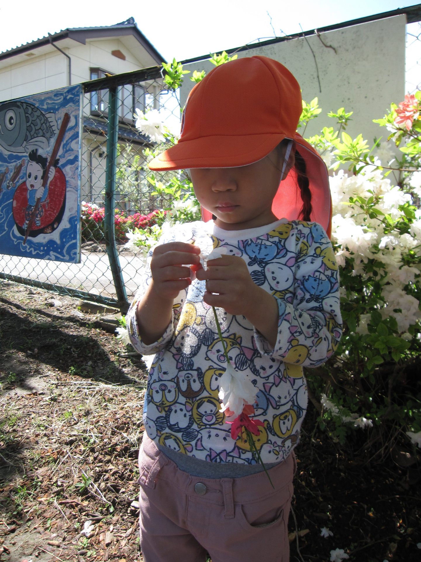今年度、異動してきた先生が教えてくれた遊び方で、子どもたちもびっくりしながらも楽しんで作っていました。毎年咲き、とても身近な花なので、今年の経験をまた来年も楽しんでいってくれたらと思います。おうちの人からも「きれいだね~」「がんばってつなげたね」と喜んでもらえ、さらに笑顔の子どもたちでした。