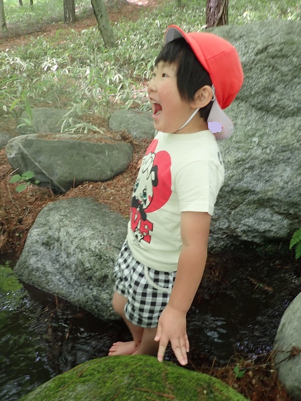 川に入ってみよう!「ギャーー!!冷たい!」とこの表情。