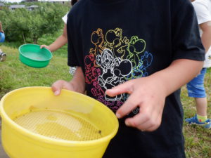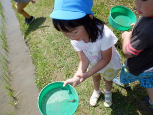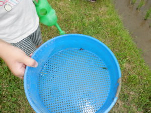 「これだと水が抜けるから捕りやすい。」とザルを選んだ子。それを見て真似してザルを選ぶ子がいて