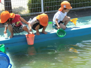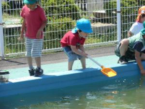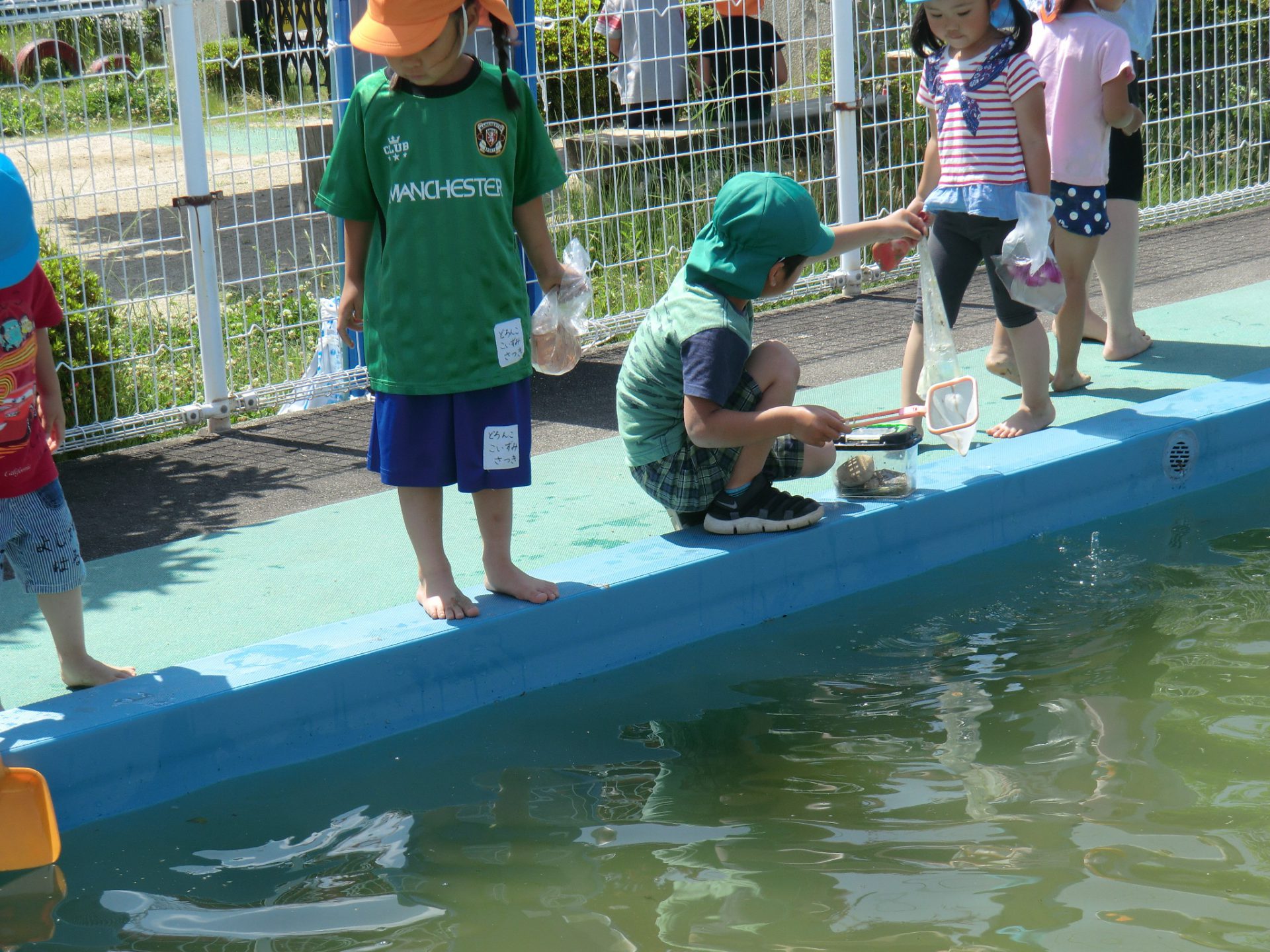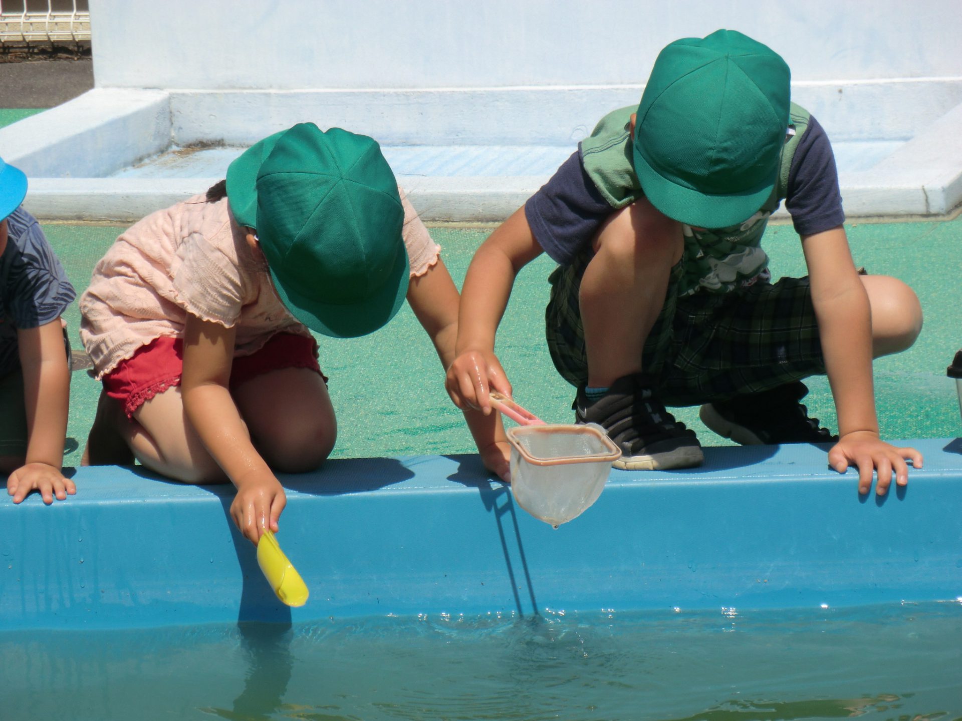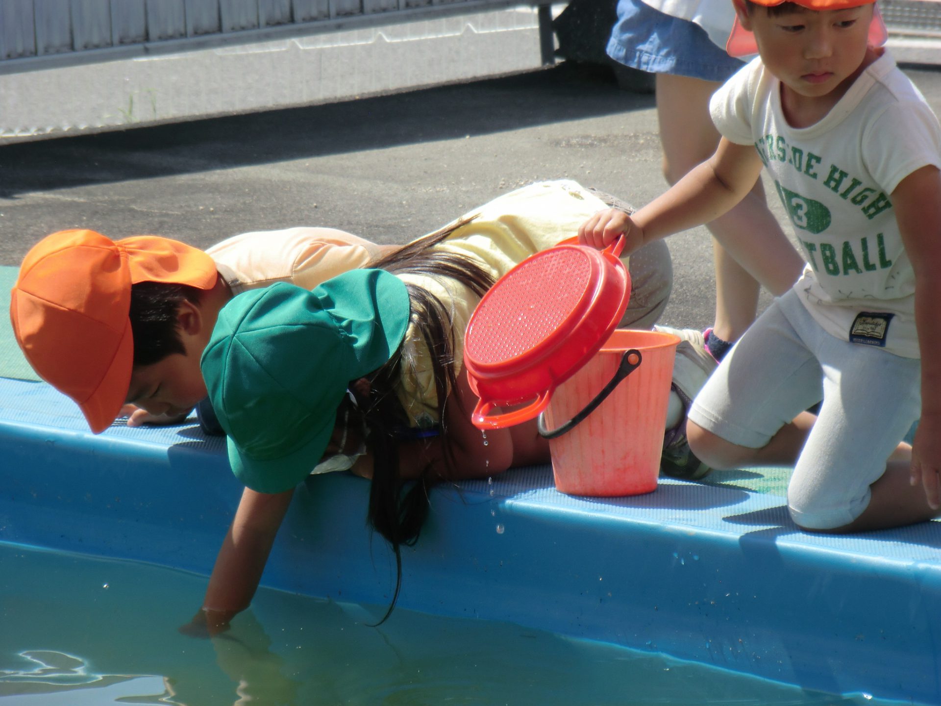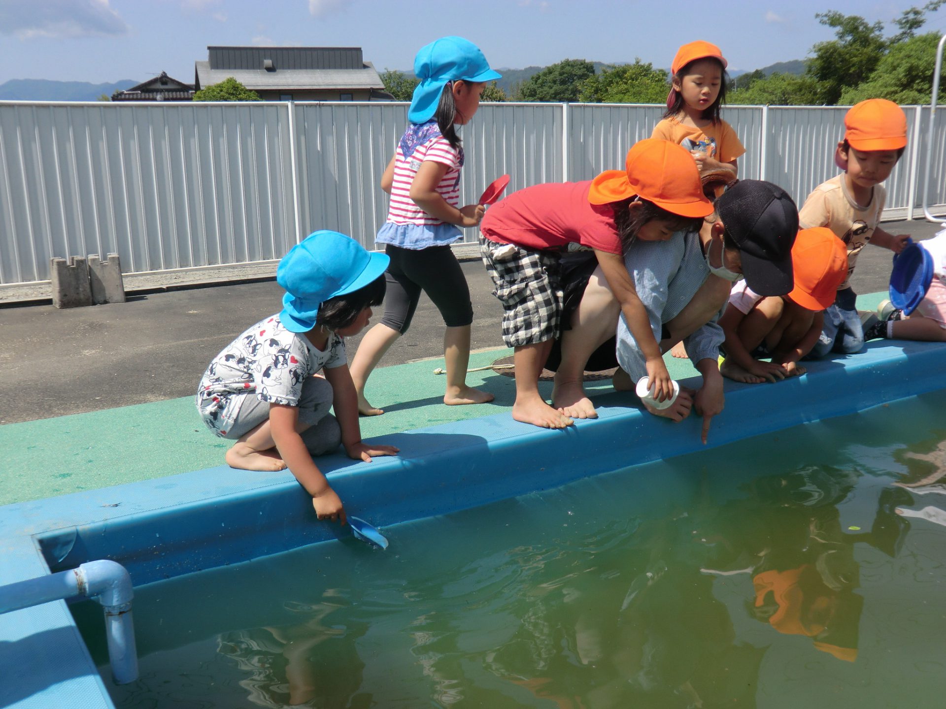 プールで何やらしていることに気がついて子供たちがプールに入って様子を見に来たり、我も我もとおたまじゃくしを取ろうと楽しめた。