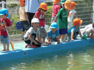 その様子を見ていた保育士が、「捕まえたいの?」と聞くと「捕りたい」というので、「プールを開けるから、あとは自分たちでいるものは用意してね」