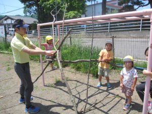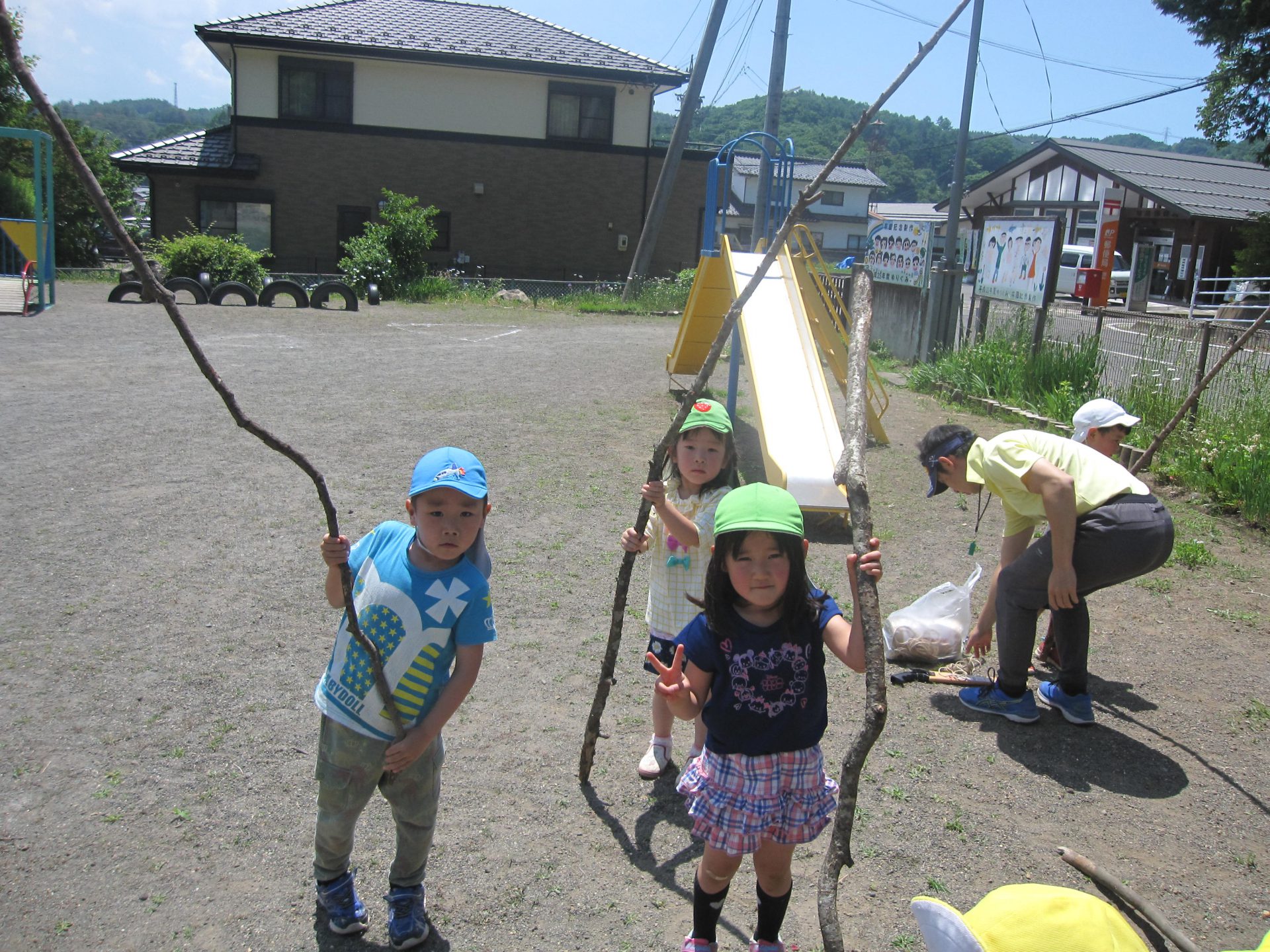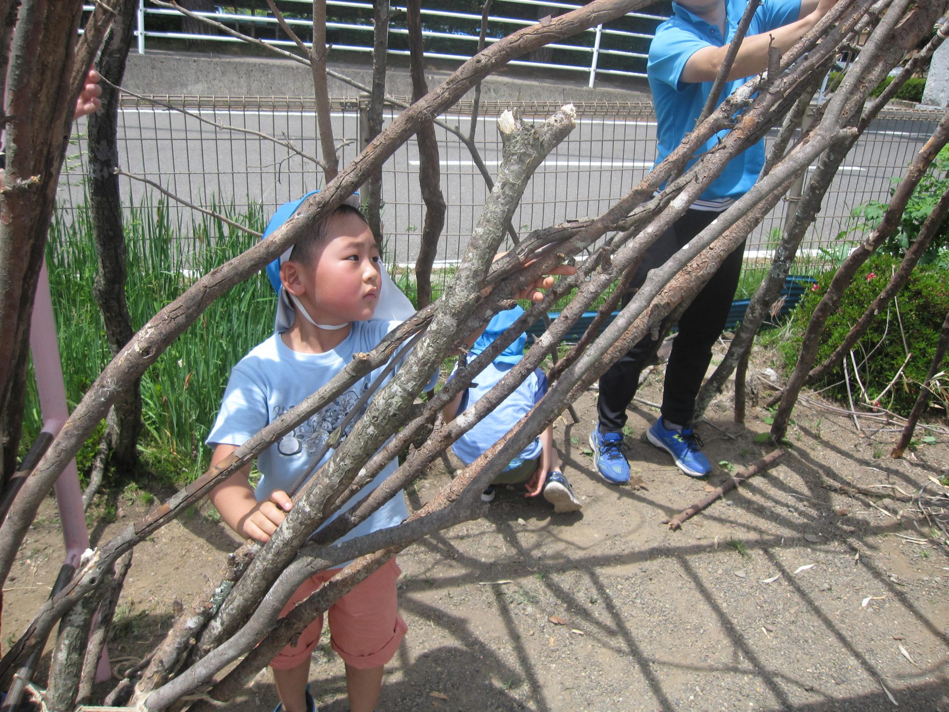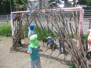 「なんかテントみたいだね」「キャンプやろうよ」「ご飯も食べたいし、寝れるかな?」「あの中に本物のテントいれちゃうか!!」子どもたちのアイディアがどんどん出てきます。完成したら保育園の名前を書いた看板を付けたいそうです。