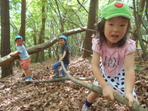 ターザンロープや枯葉のそりすべりなど一年中楽しめます。最近の子どもたちのブームは長い枝を拾って持ち帰ること。