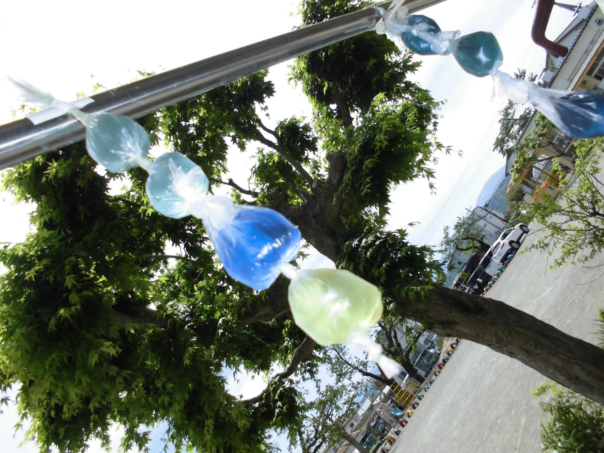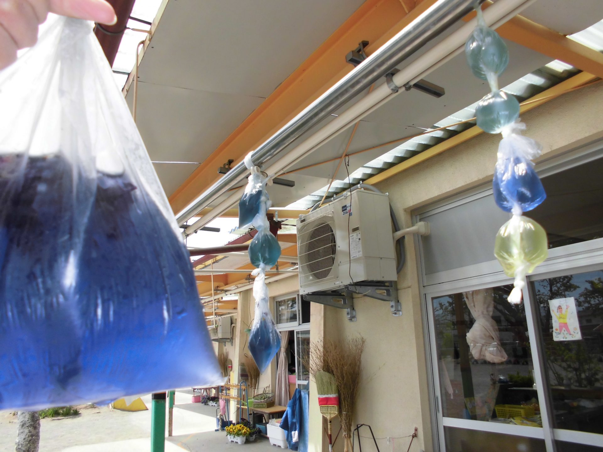 ・今年度は園庭でたくさん自然に触れて楽しんでもらいたい!と職員で話し合い、コーナー作りを進めることにしました。その一つとして子どもたちが今とても興味をもっている色水遊びをコーナーにしてみました。