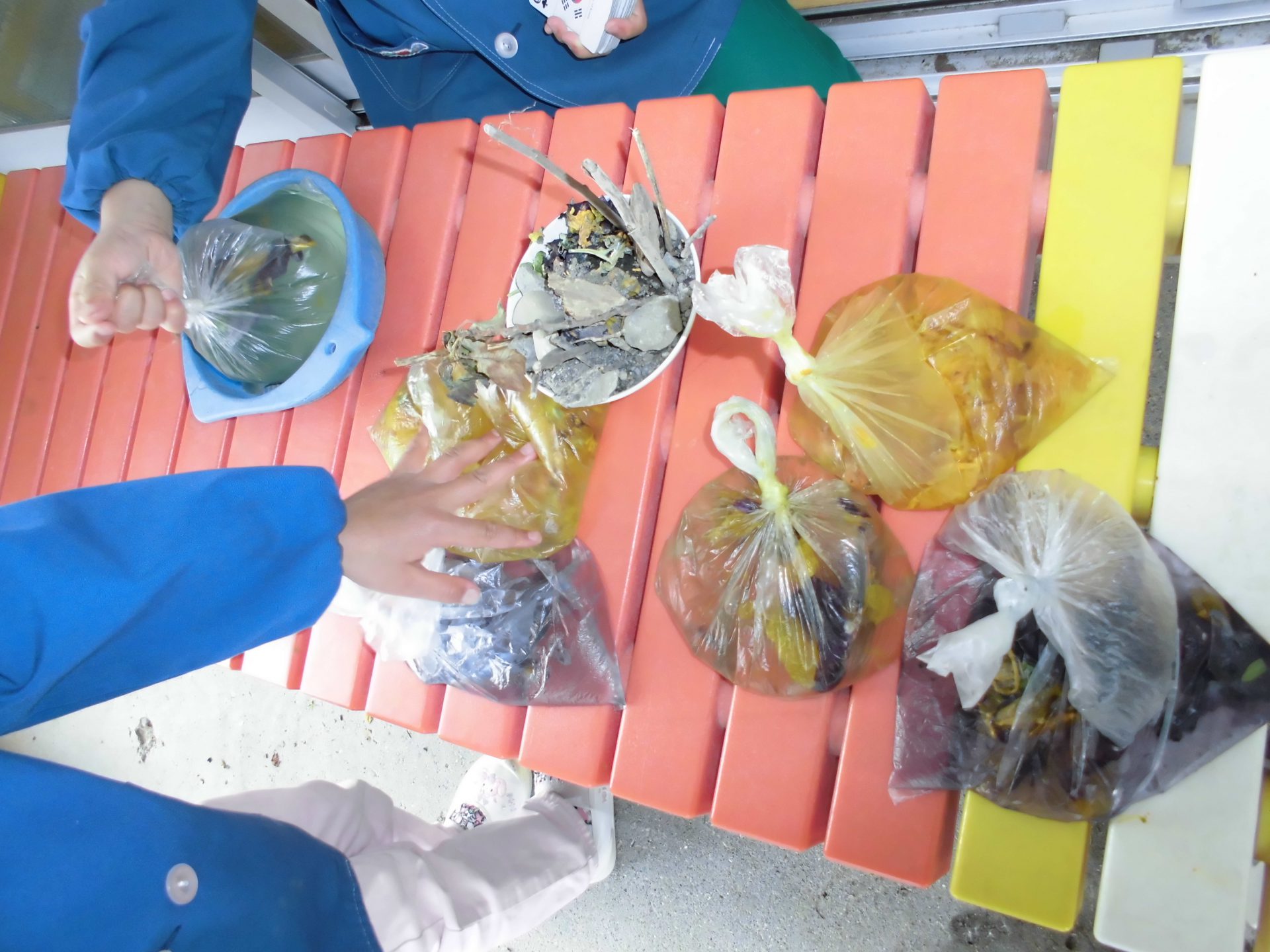 🌼「混ぜ混ぜ実験じまーす!」「みどりを作るには、黄色の花びら〇枚と、紫の花びら〇枚だよ!」と割合に気づく子もいました。