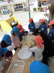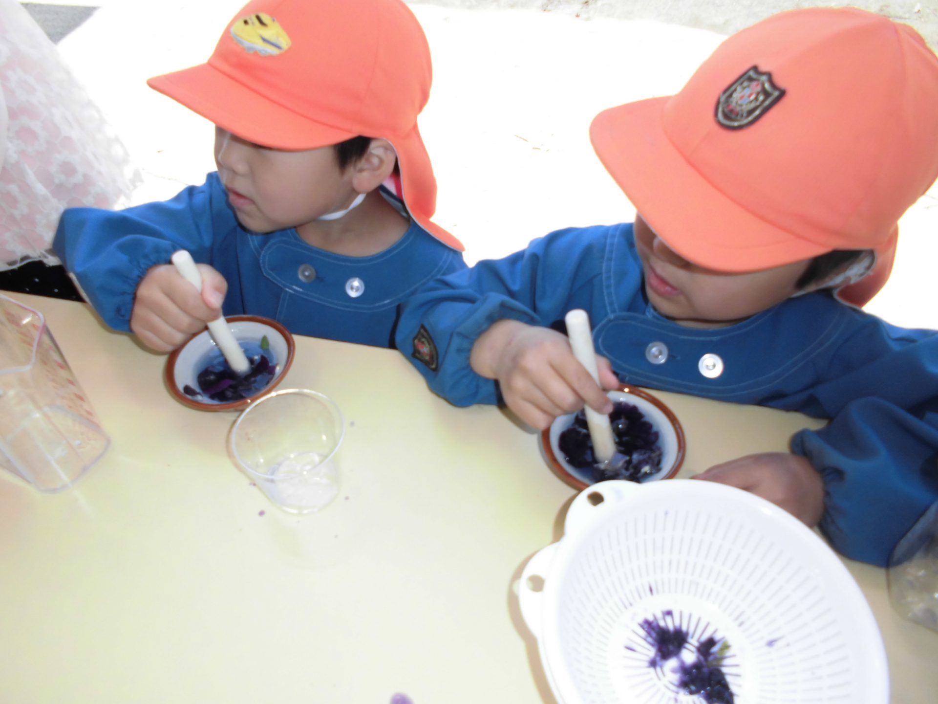 ・毎年夏の朝顔を楽しんでもんでいますが、今年はパンジーでも挑戦。手でもむだけではうまく色が出ないことがわかり、すり鉢を用意してみました。また、実験のように様々な色の組み合わせを楽しめるようにメモリ付きの透明のカップや、お店屋さんができるようにカップをたくさん用意したりもしました。だんだん増えていく道具に、子どもたちの発想も膨らみ、充実しつつあります。