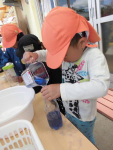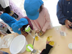 🌼「違う色がいっぱいできるよ!」「わ~きれい!」といろんな色ができることを発見し、嬉しそうな子どもたち。