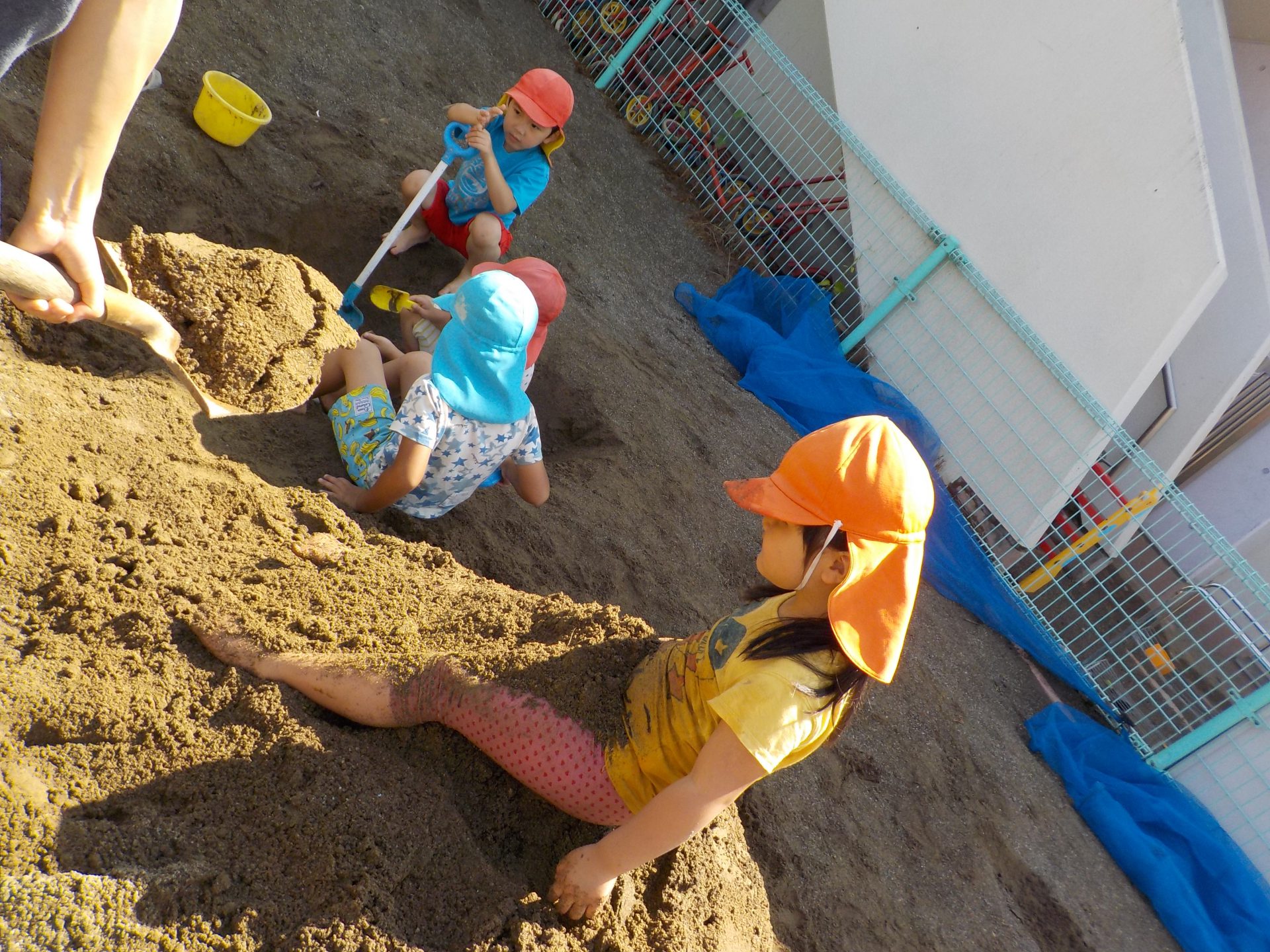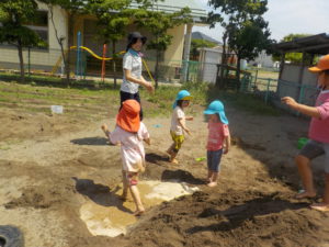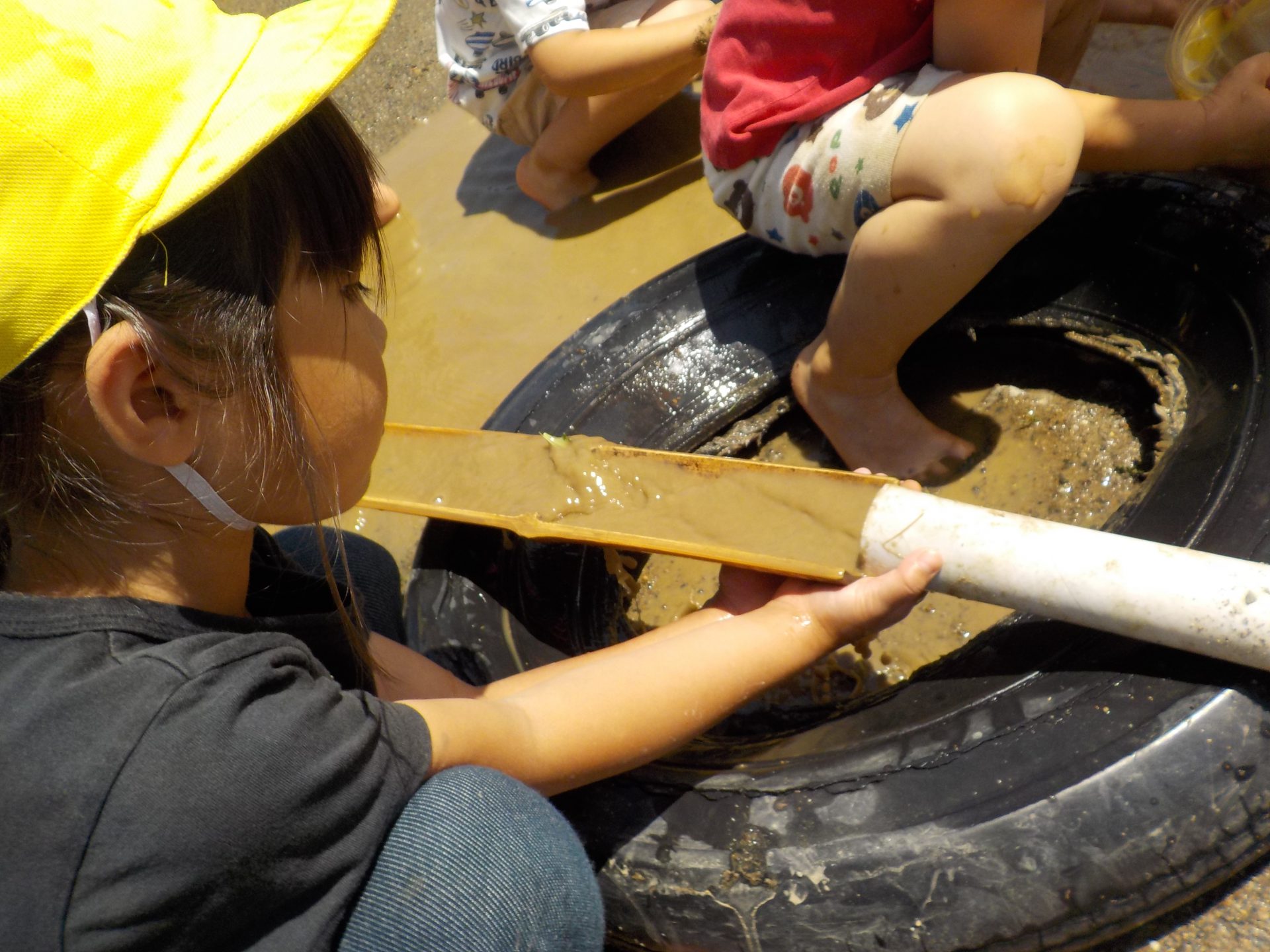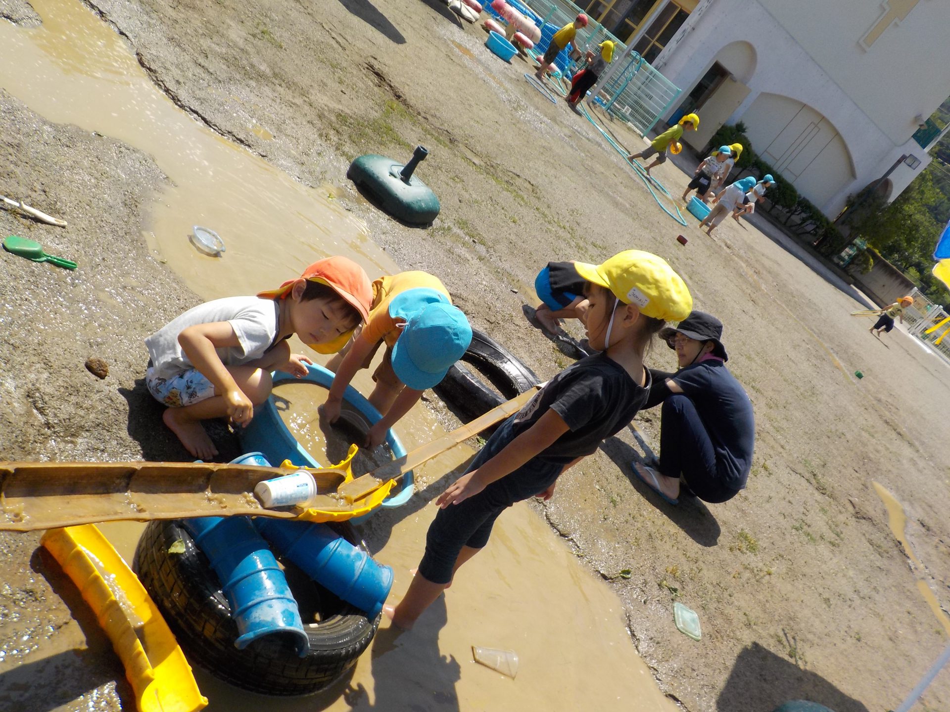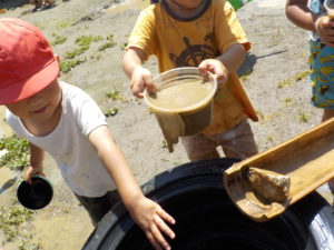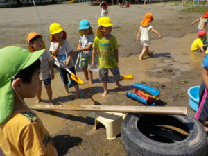 子ども達が、水の流れる方向を観察して、気付くような環境を作ったので、自分たちで考えて試行錯誤をし、川の流れを作ることができました。