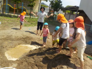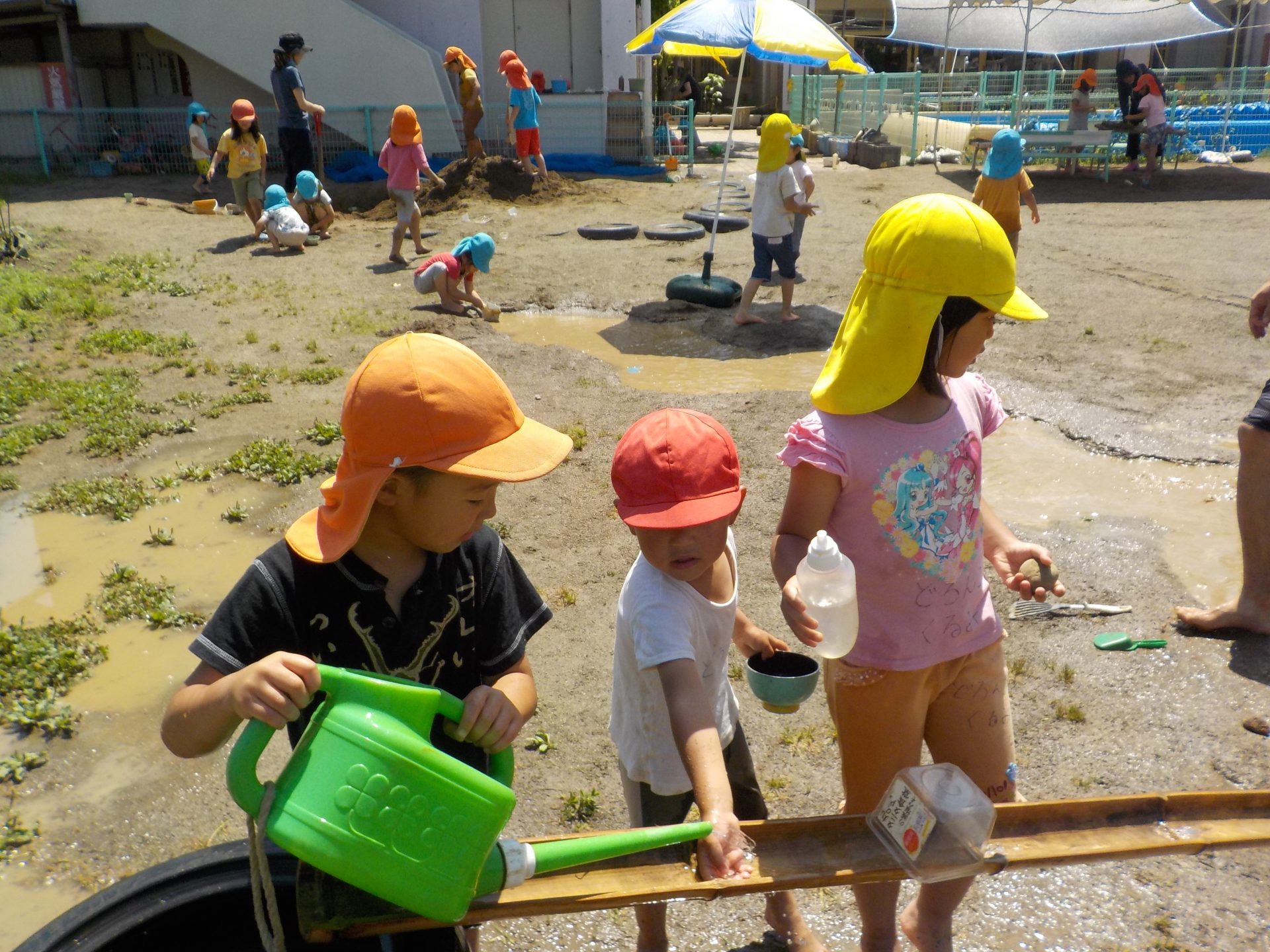 穴が大きくなると「水をためよう!」ということで、みんなでバケツやジョロで穴に水をいれました。