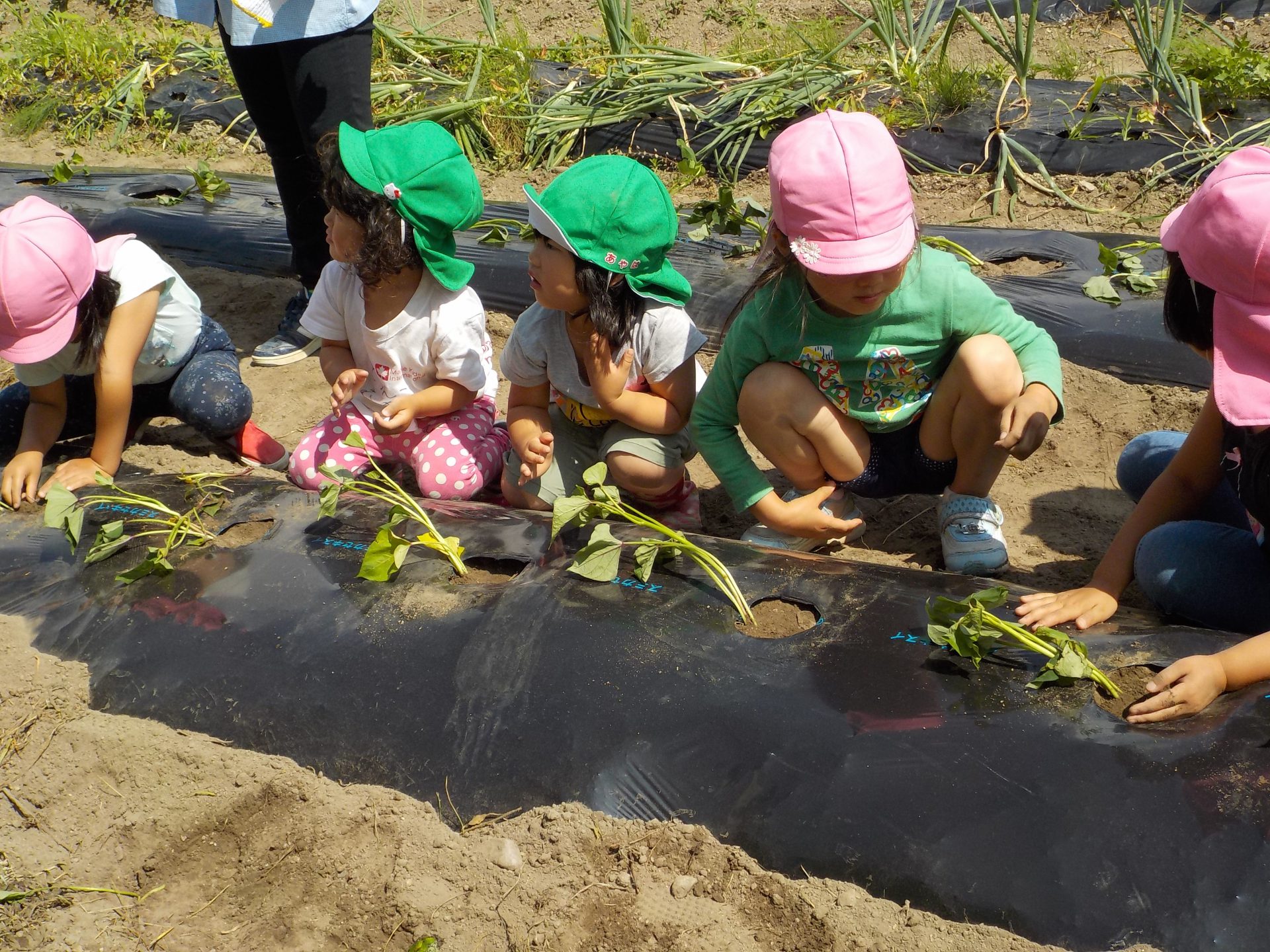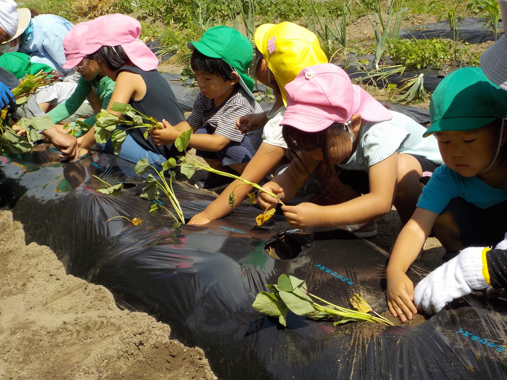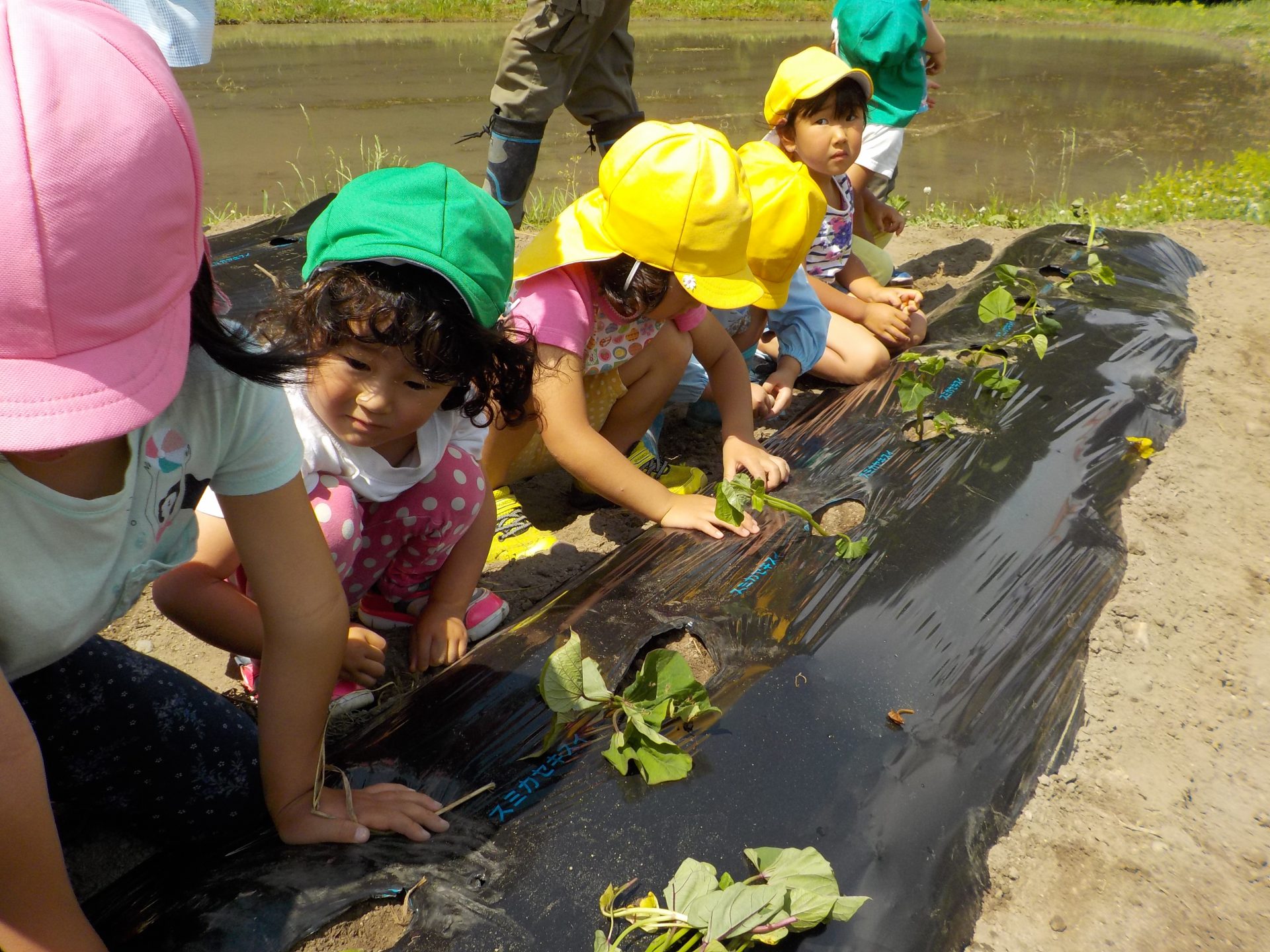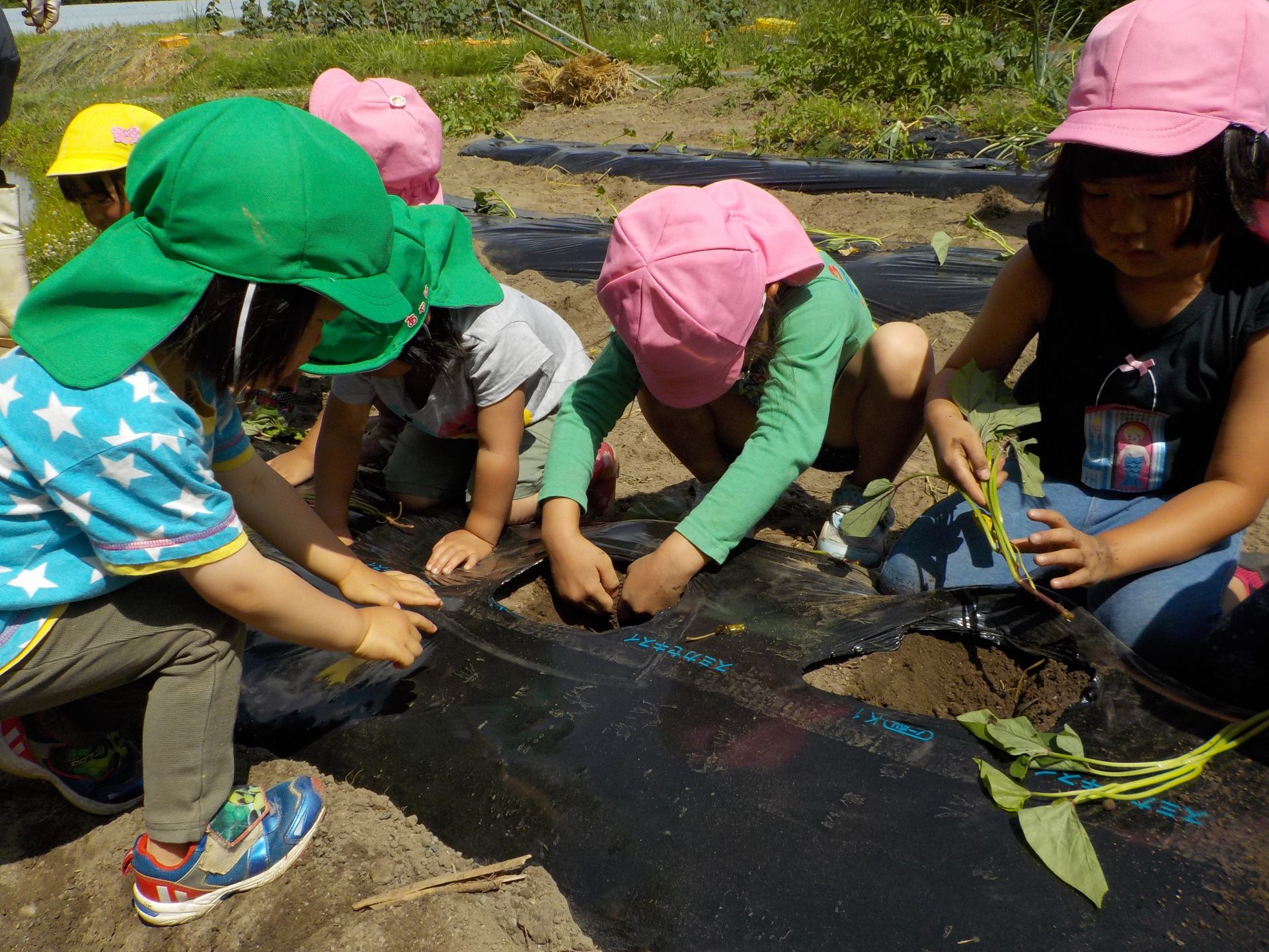 「苗を立てて植えるとお芋が1個しかできないよ。斜め30°位寝かせて植えると