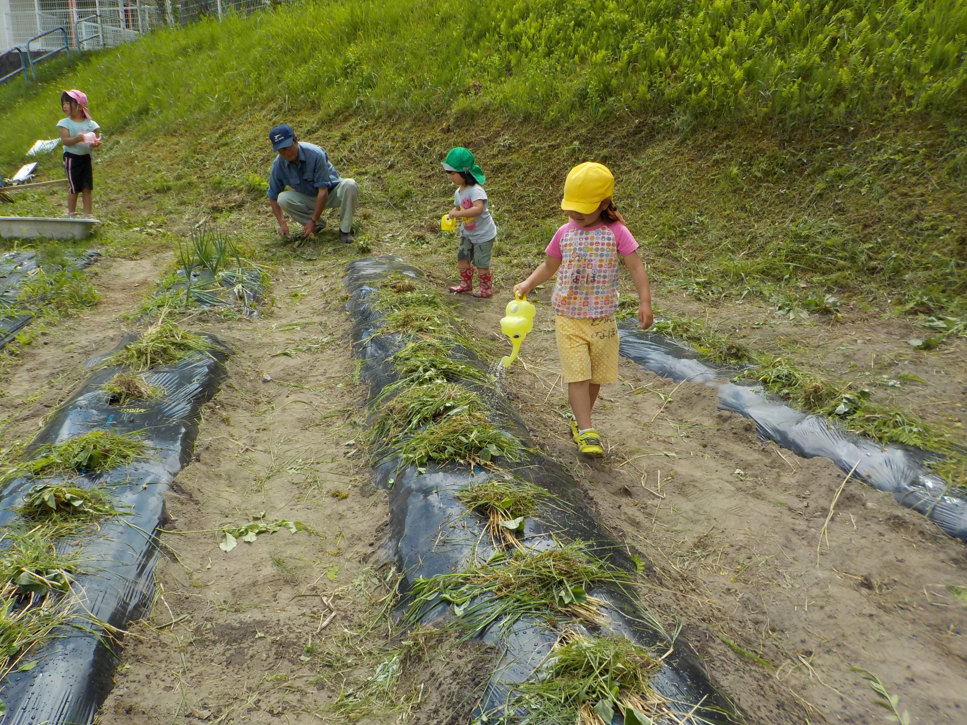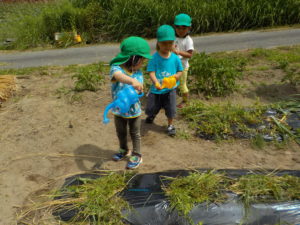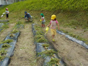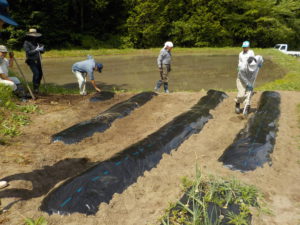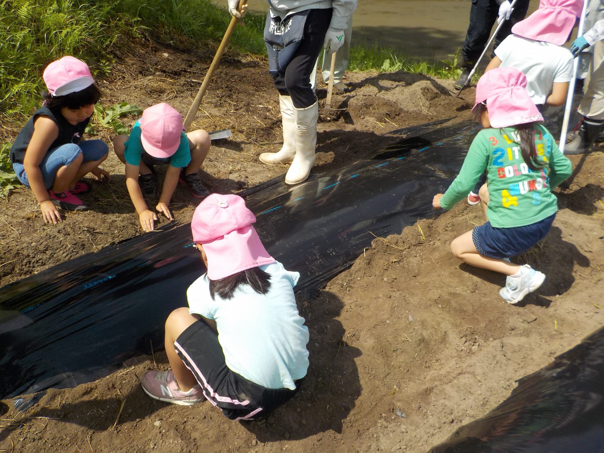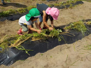 始めは畝づくりとマルチかけです。年長ぞう組さんがお手伝いをしました。