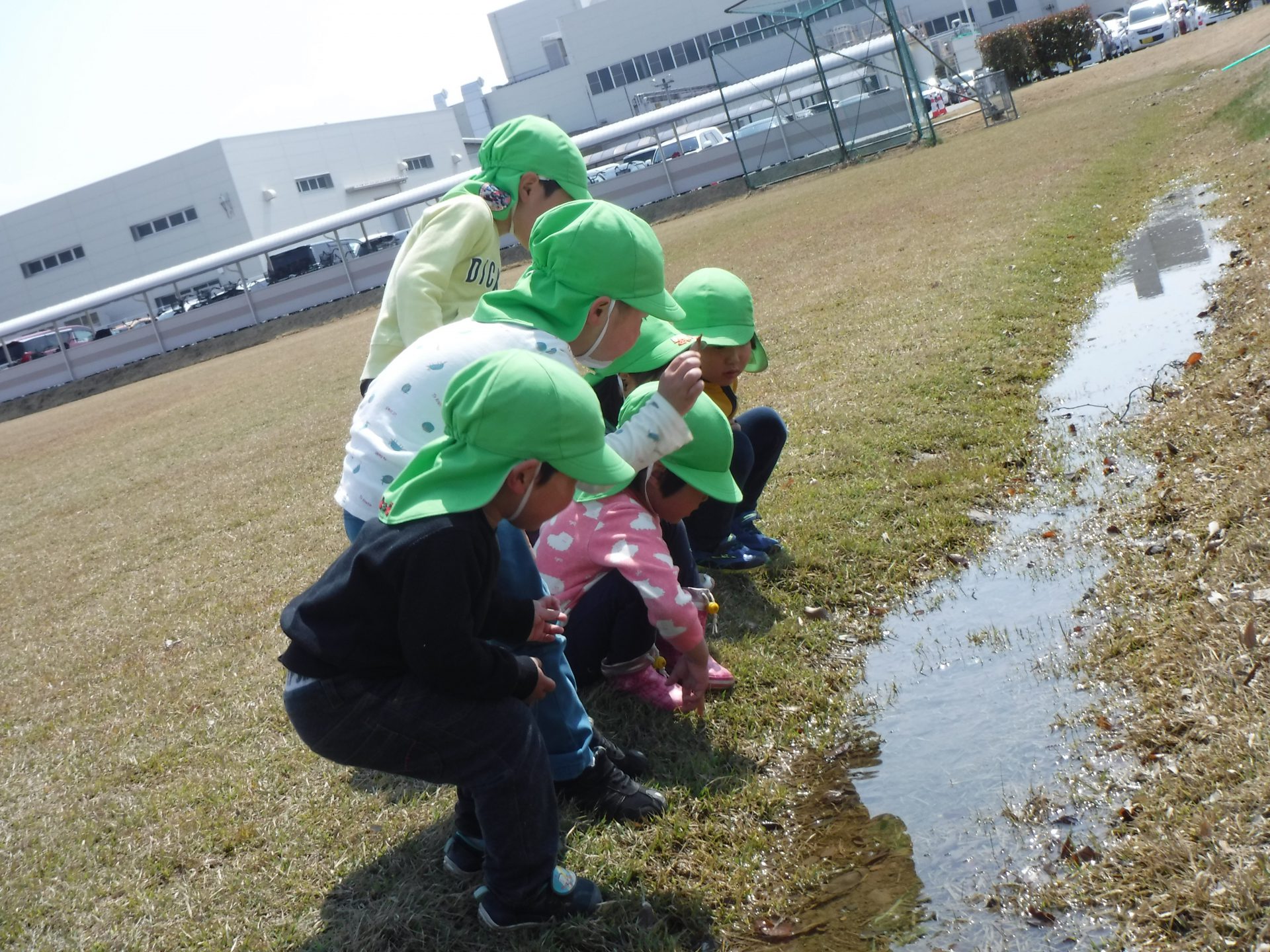 途中、田んぼでおたまじゃくしやかえるを見つけ子ども達は大喜び。見たり触れたりして楽しみました。