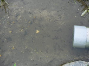 「おたまじゃくしとりたいなー 手でとれるかな?」と手を田んぼの中に入れてさぐります。
