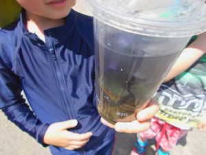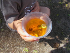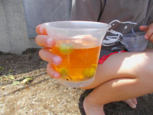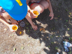 水遊びを楽しむなかで、子ども達の気づきから、園庭にある身近な自然物に親しみ遊ぶ姿がありました。