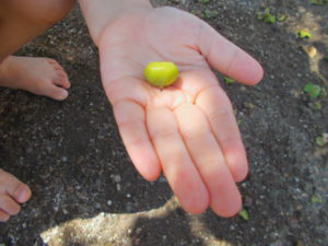 落ちていた小さな柿の実を拾う子ども達。