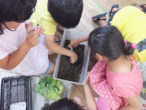 「白菜食べたのかな~?たくさん食べて大きくなってね!」と応援する子どもたち。