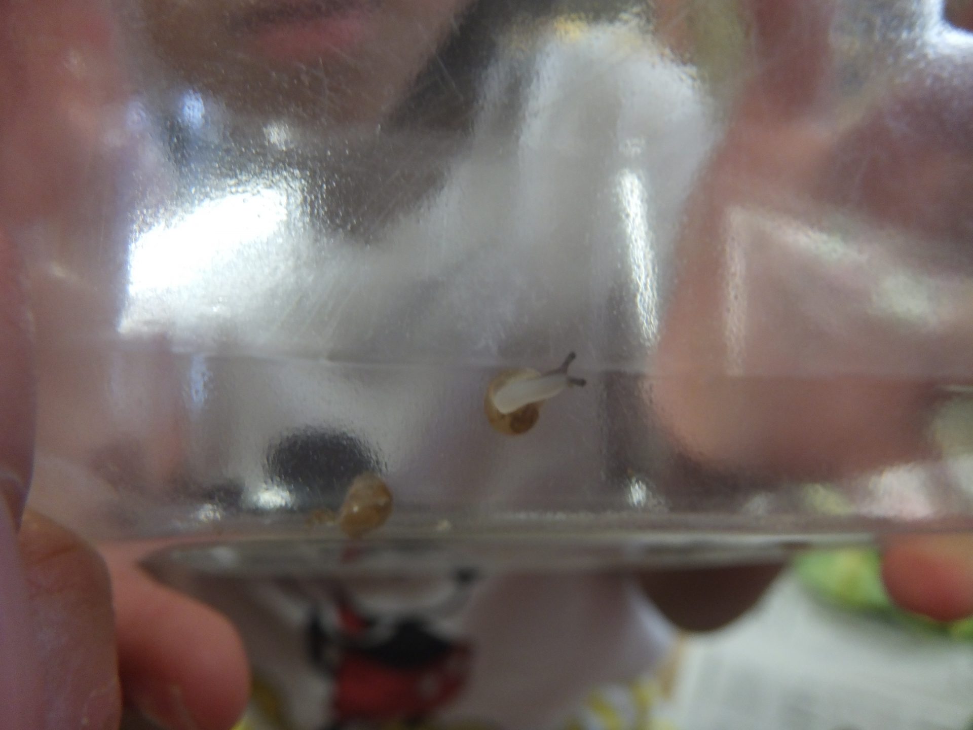お母さんカタツムリに赤ちゃんカタツムリを見せて、「見て~赤ちゃんだよ~」と声をかけるB君。