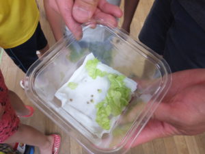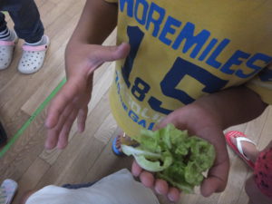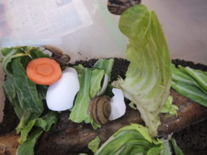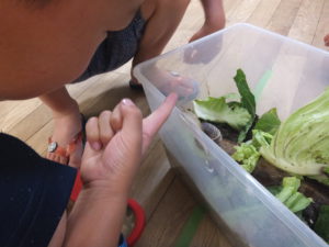 「赤ちゃんカタツムリは柔らかい葉っぱと卵の殻を食べるんだよ。これは、白菜だよ。」と教えてくれました。