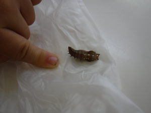 枝を揺らしたら、下に落ちてしまったサナギ。そっと触ってみたらびくびくと動きました。
