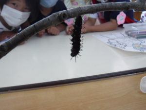 パンジーのプランターに、黒とオレンジ色の虫を発見した子ども達。毛虫かと思っていたら毛が生えていないことに気が付き、図鑑で調べてみると・・・