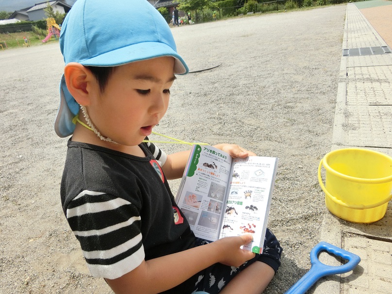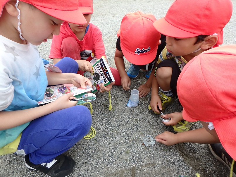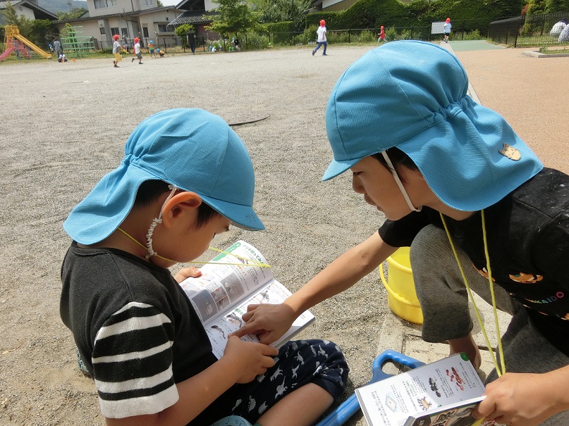 図鑑とルーペを両手に持って園庭を駆け回り、昆虫や生き物を調べている子どもたち。「この虫は何だろう?」と子ども同士で興味や関心を深めています。まずは身近な生き物に興味を持とう!