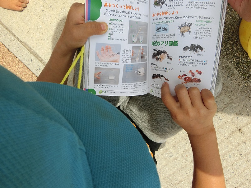 庭で大きなアリを捕まえました。ルーペを使って観察中です。