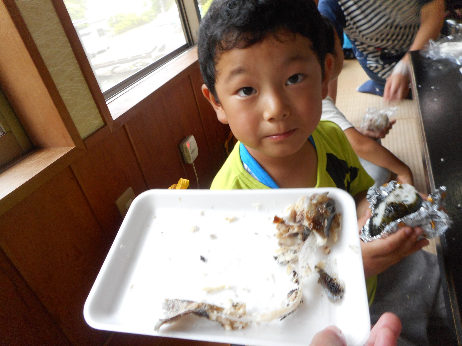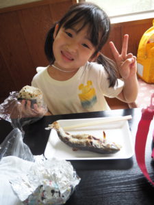 自分たちで釣ったニジマスの塩焼きと、おうちの方につくってもらったおにぎりです。