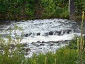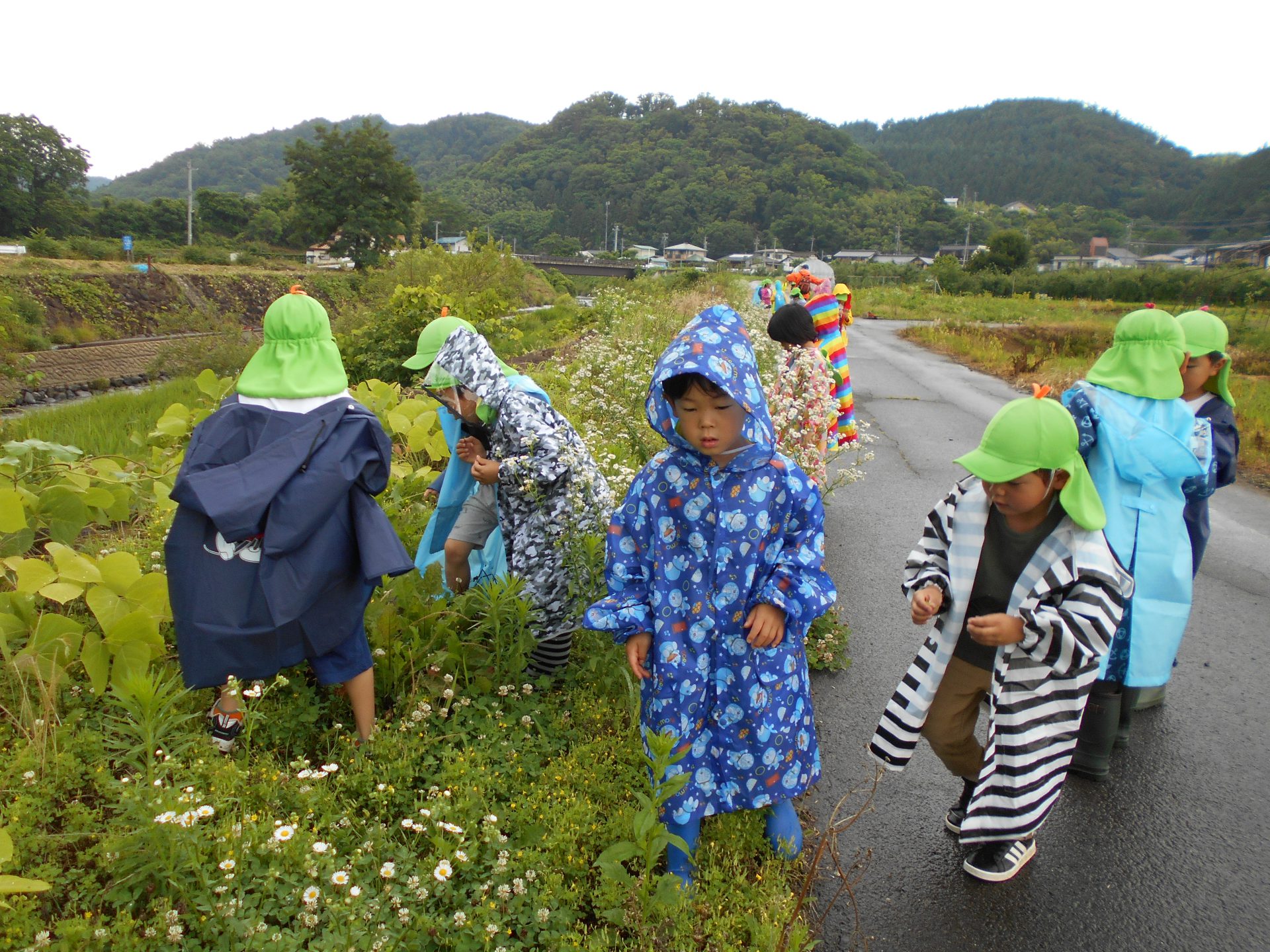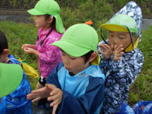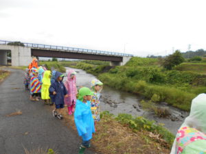 川の音を聞いたり、かっぱに落ちる雨の音を聞いたりします。