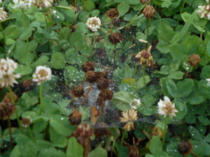 クローバーの上に蜘蛛の巣があって、雨の露が揺れてきれいです。
