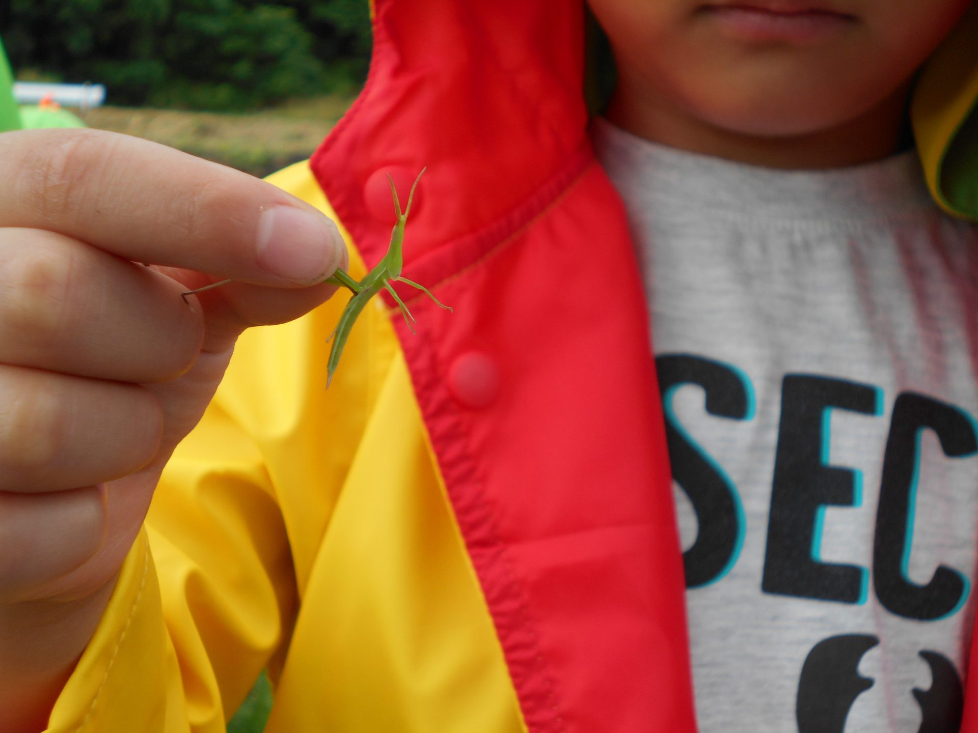 草むらに入ると最初は濡れていやがっていたけれど楽しくなってバッタを見つけたり