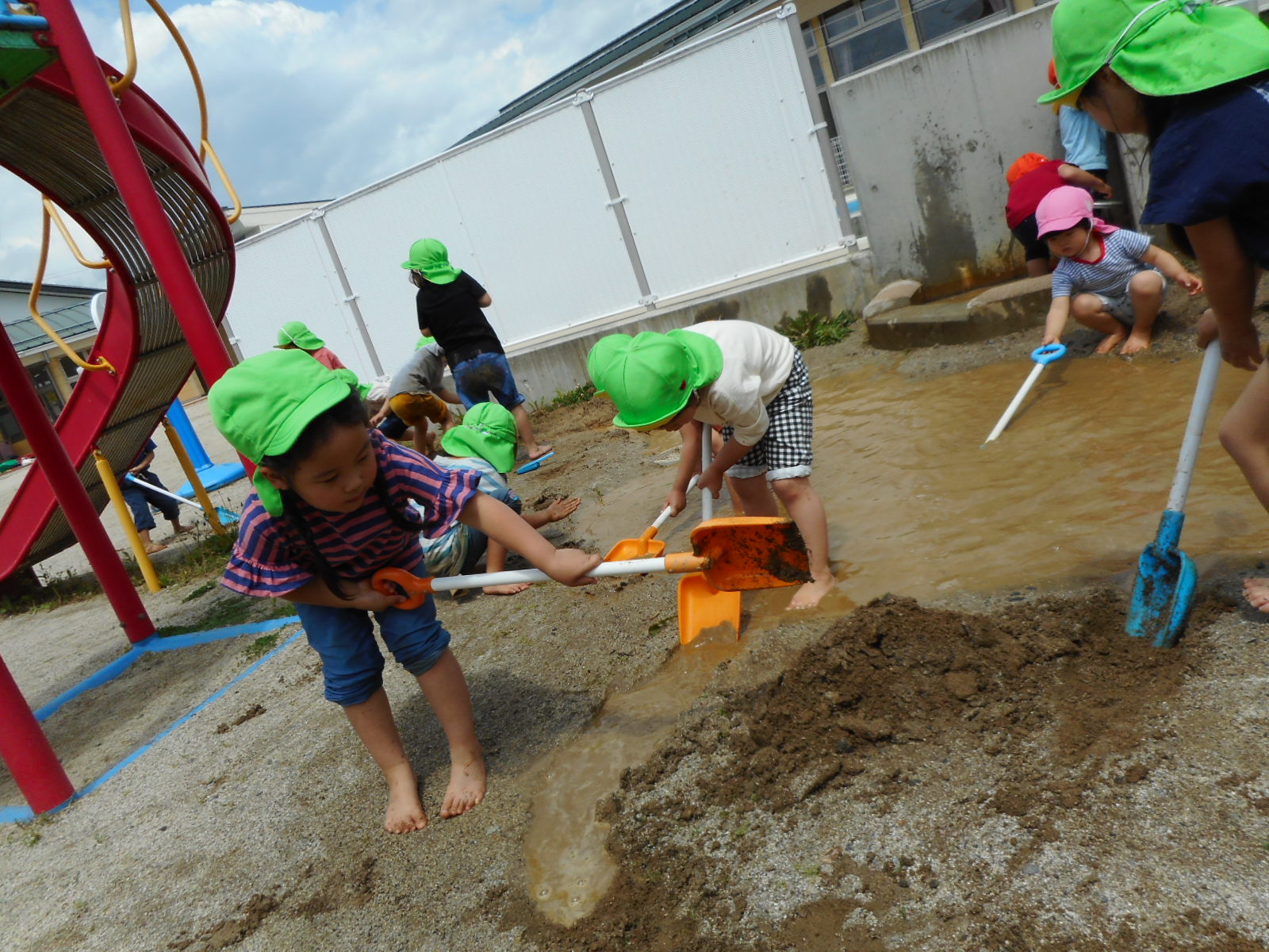 園庭の隅には、代々作り続けられている子どもたちの池・川があります。